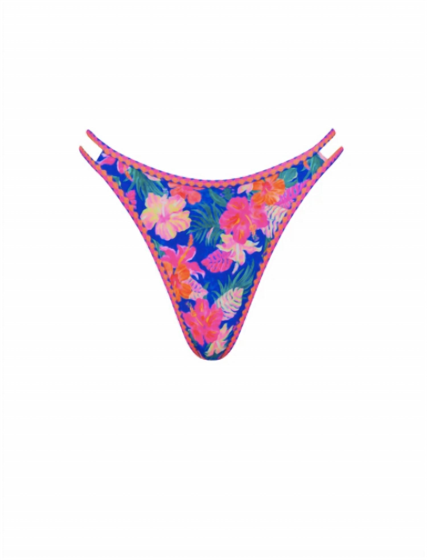 Dream of your next beach getaway in this cute little number. Pair with strappy sandals, a floppy hat, and an oversized tote to complete the perfect vacation look. Dive into your beach adventures with the Women's Twin Strap Cheeky Bikini Bottom by Kulani Kinis in vibrant Electric Palms. Embracing a boho chic vibe, this bikini bottom features a floral pattern and cheeky coverage, perfect for a sun-filled beach day. It’s a stylish choice for women who love bold, summer-ready colors and designs. This swim bottom is unlined and crafted to enhance your summertime wardrobe.