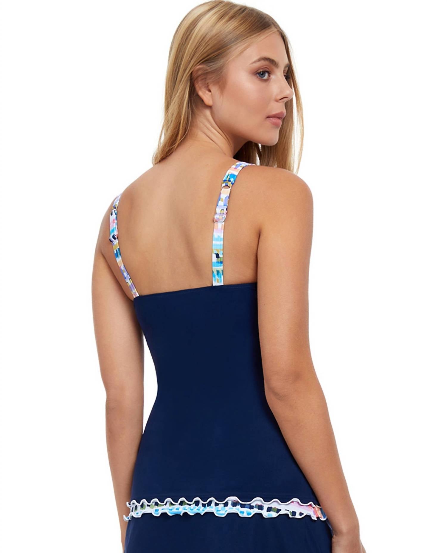 Ideal para momentos relaxantes à beira da piscina, este adorável maiô se transforma facilmente no traje perfeito para um jantar ao pôr do sol quando combinado com uma saia esvoaçante. Este top tankini com bojo D apresenta sutiã com aro e bojos de espuma, alças ajustáveis. Decote redondo e detalhes franzidos. Malha 72% poliamida, 28% elastano.