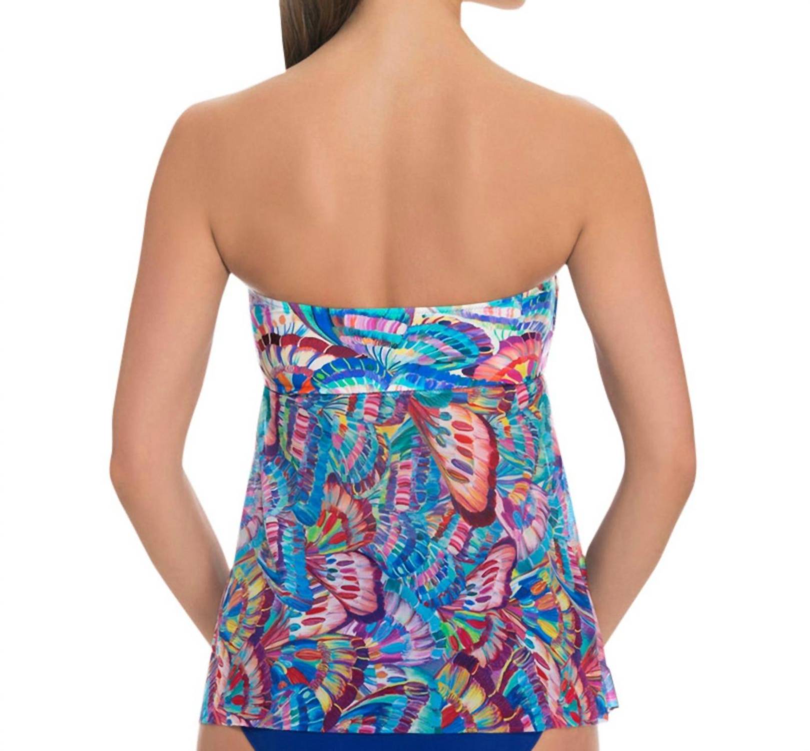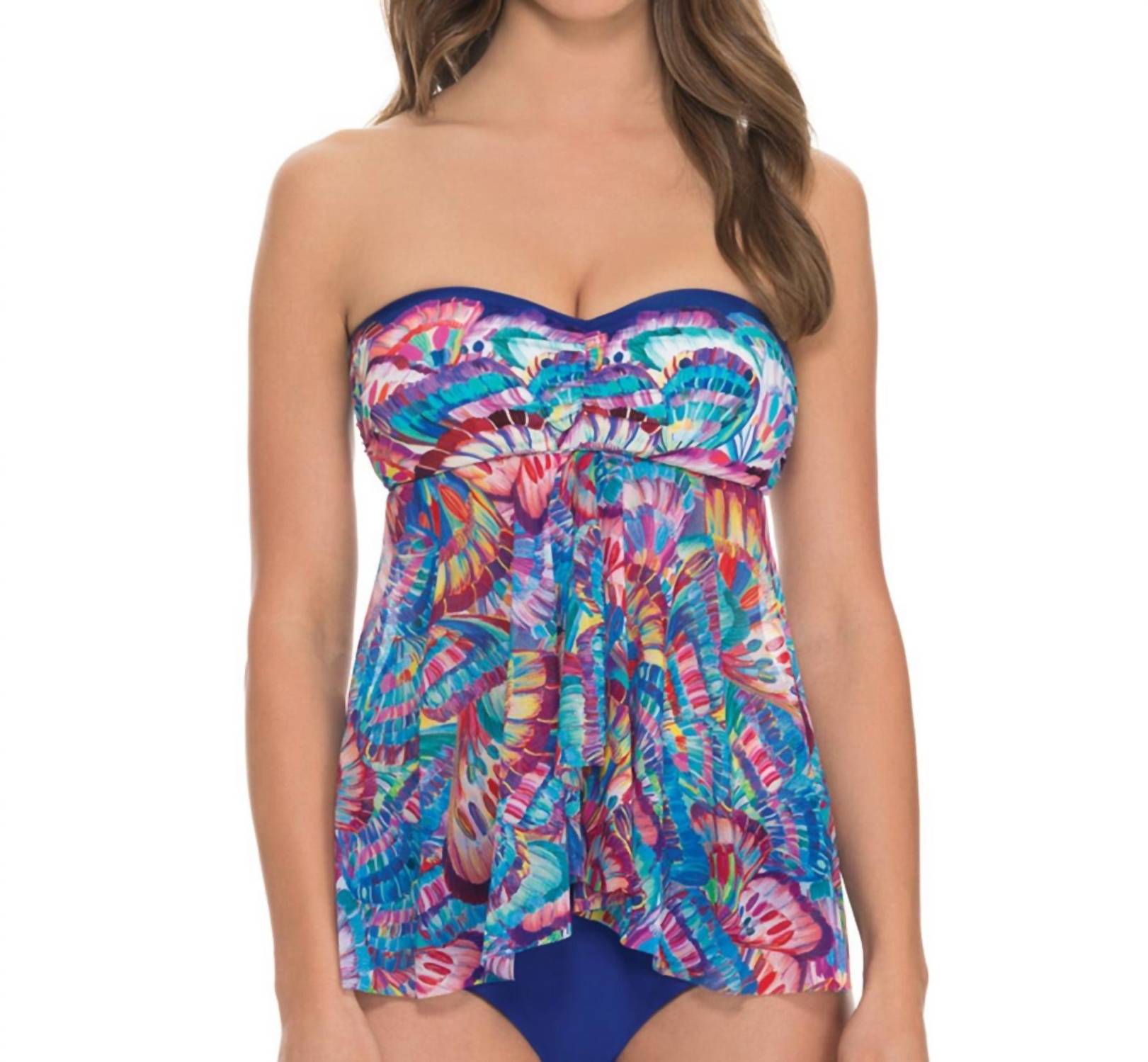 Este top tankini apresenta sutiã com aro e bojos removíveis. Decote coração com top frente única. Tronco visualmente esbelto com corpete franzido. Amarração frontal ajustável por deslizar. 72% poliamida, 28% elastano.