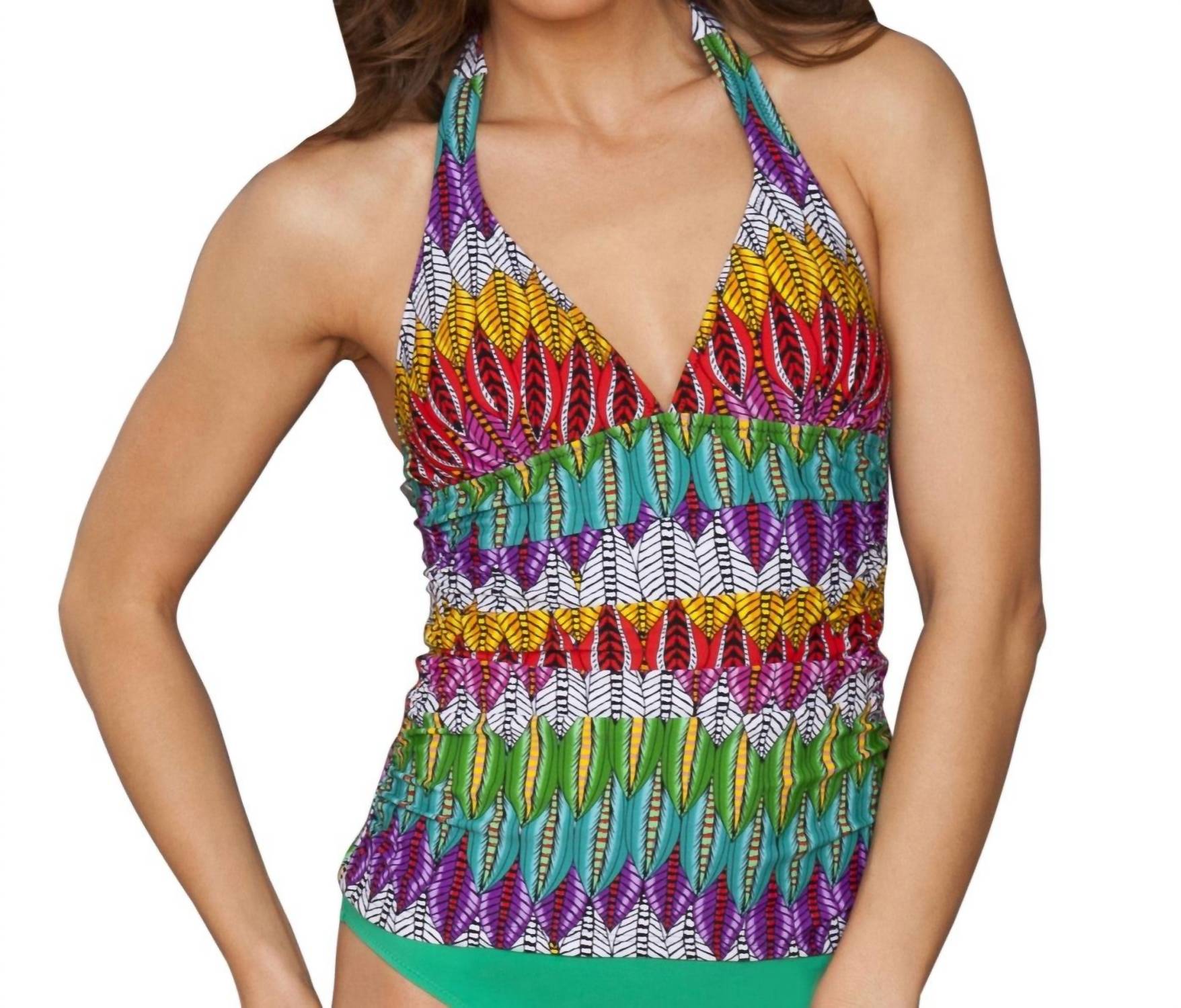 Apresentamos o Top Tanquíni Halter Mexicana da Profile By Gottex, criado para oferecer estilo e conforto. Este top de natação, com bojos moldados e macios, oferece um ajuste personalizado com amarração estilo halter e um decote em V profundo que acentua o busto. Composição: 72% poliamida, 28% elastano, com corpete franzido lateral e estampa gráfica vibrante para um efeito visualmente adelgaçante. Aposte neste tankini estampado feminino para cobertura total e um visual deslumbrante na praia ou na piscina.