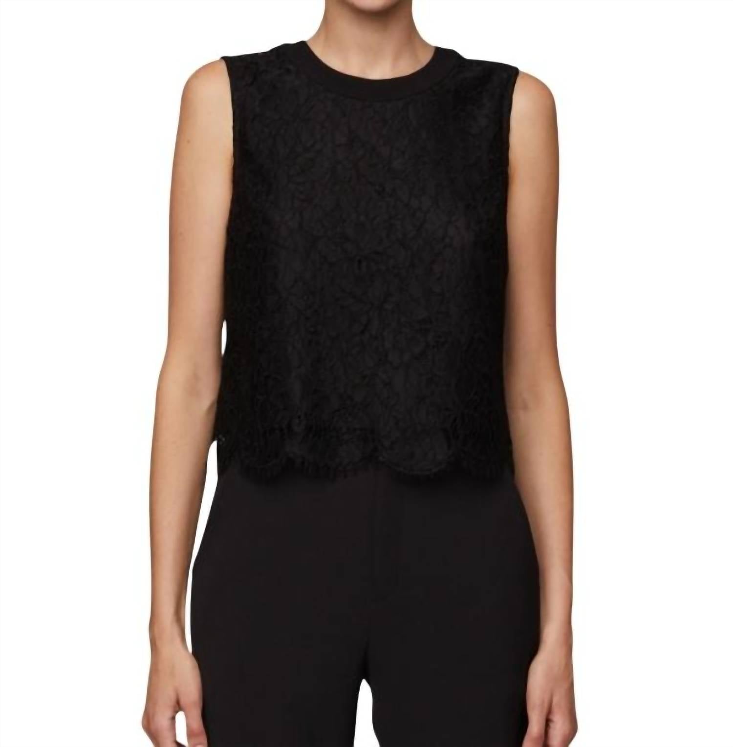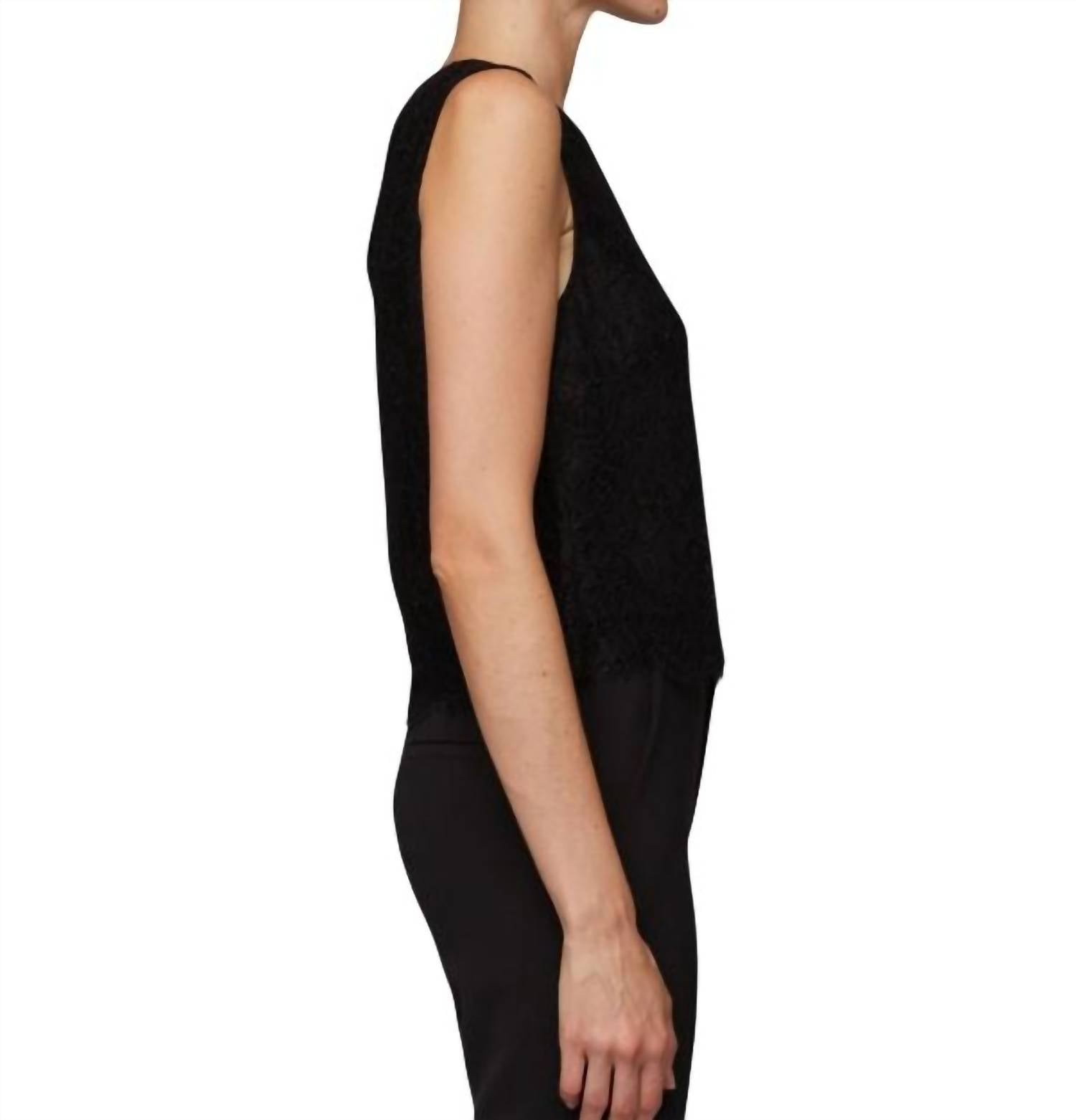 Introducing the Gia Tank Top by A.L.C., a sophisticated piece in textured black lace for an elegant, feminine touch. This sleeveless, cropped silhouette features a crewneck design with delicate eyelash trim and a romantic keyhole button-back closure. Composition: 54% Rayon, 27% Nylon, 19% Cotton. Care: Dry clean only. Perfect for New Year's Eve or a chic dinner party, this 90s fashion-inspired top is ideal for pairing with high-waisted trousers or a skirt.