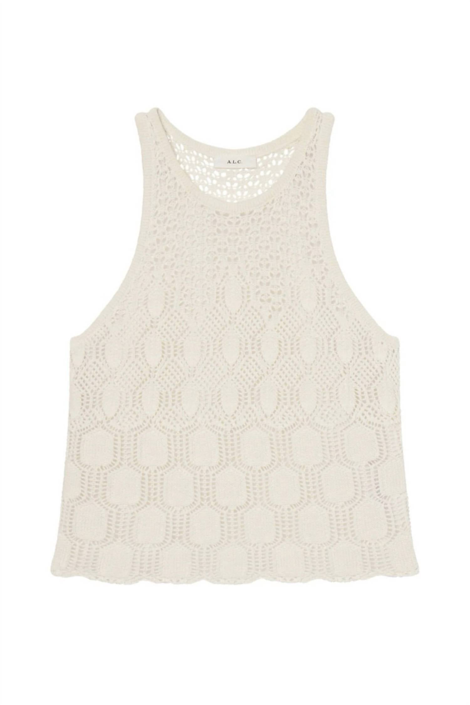 Introducing the Rosa Sleeveless Top by A.L.C., a chic piece in off white designed for an effortless vacation look. This top boasts a fitted halter silhouette with a striking openwork pattern for added flair. Crafted from a luxurious blend of 66% Cotton, 17% Silk, and 17% Tencel Lyocell, it promises comfort and elegance. Closure: Pull-on. Care: Dry clean only.