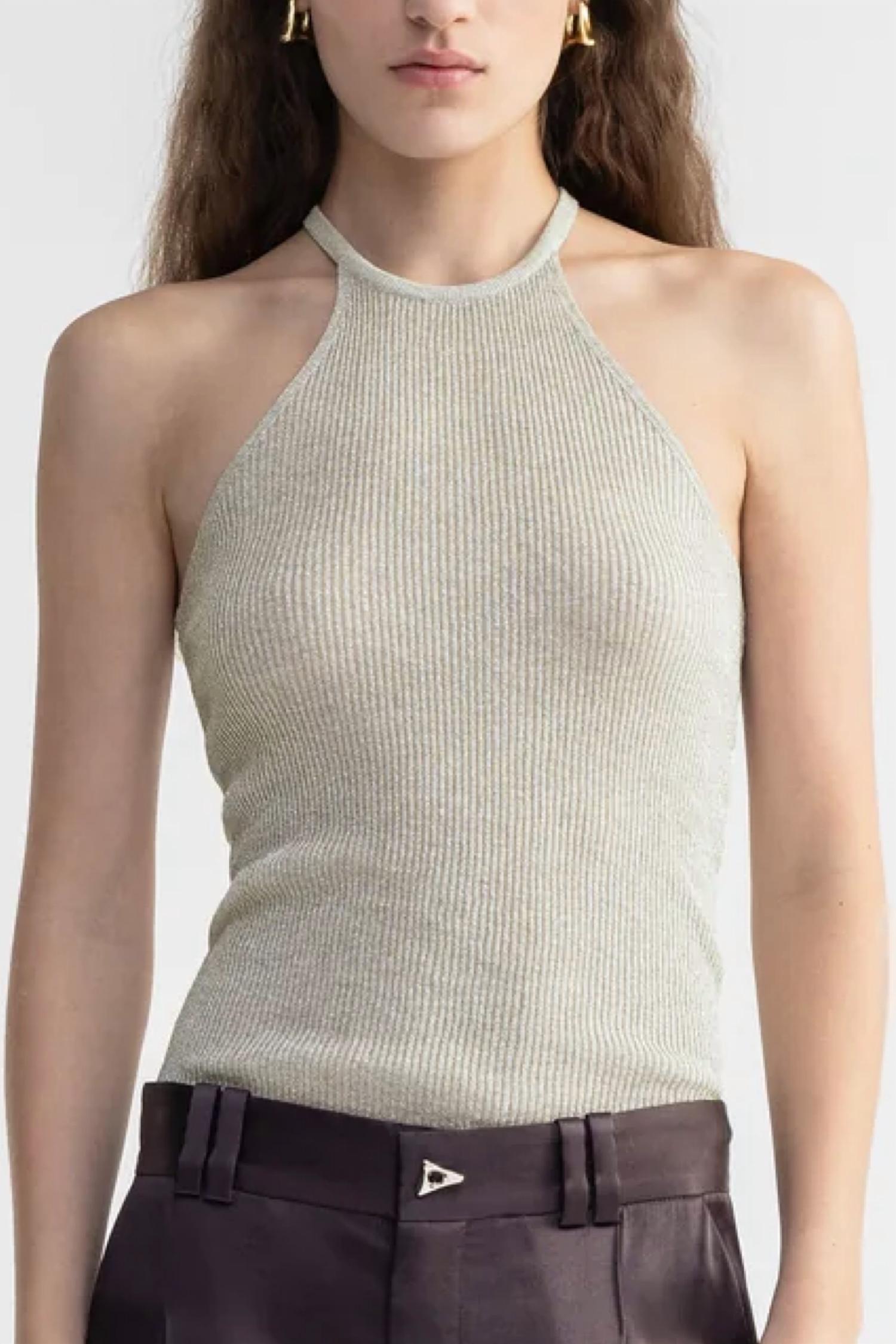 Embrace timeless elegance with the Galina Sleeveless Top by AERON, a perfect fit for minimalist summer wardrobes. Crafted from a luxurious blend of 70% Viscose, 15% Polyester, and 15% Metallized Fiber, this halter-neck top boasts a ribbed body for a fitted silhouette. The stunning ivory and silver hues create a shiny, sparkly look, making it ideal for valentines or vacation-ready vibes. Closure: Pull-on design. Care: Dry clean only.