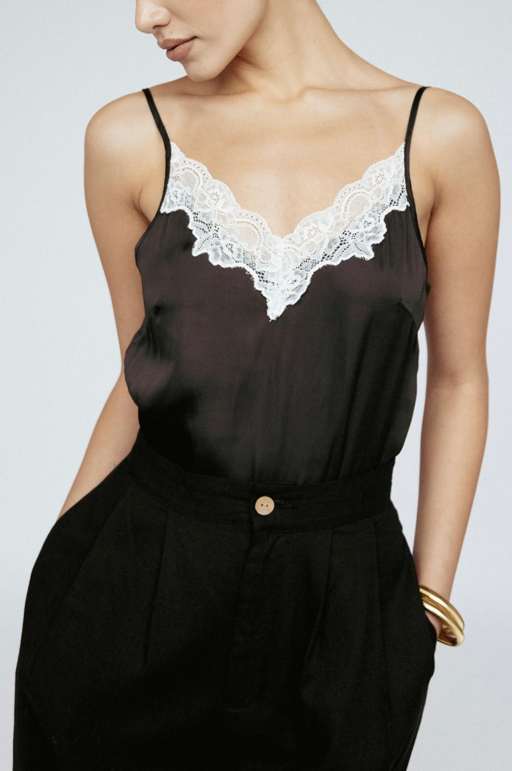 The Amanda Maria Satin Lace Tank in black is a perfect blend of elegance and everyday wear, featuring spaghetti straps and a flattering V-neckline. Crafted from 100% polyester, this tank is lightweight and fluid, designed to skim the body gracefully. Its delicate white lace trim adds a touch of softness, contrasting beautifully against the rich satin. This pull-on style is versatile enough to layer under blazers or pair with jeans for a chic day-to-night look.