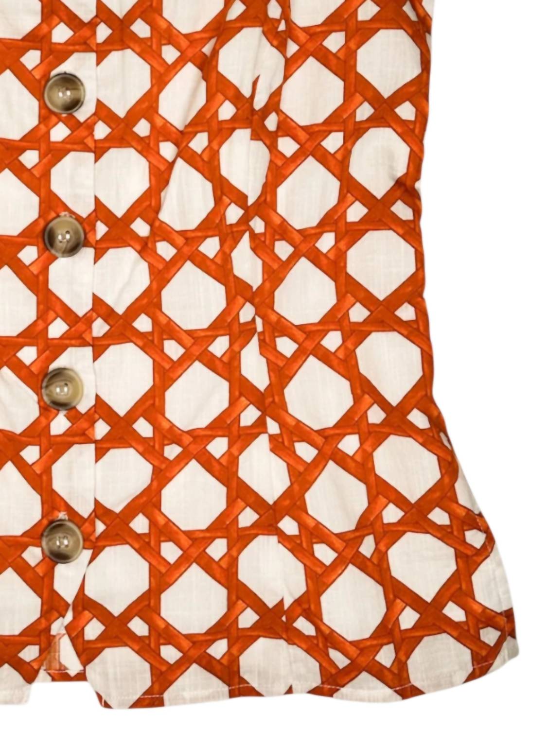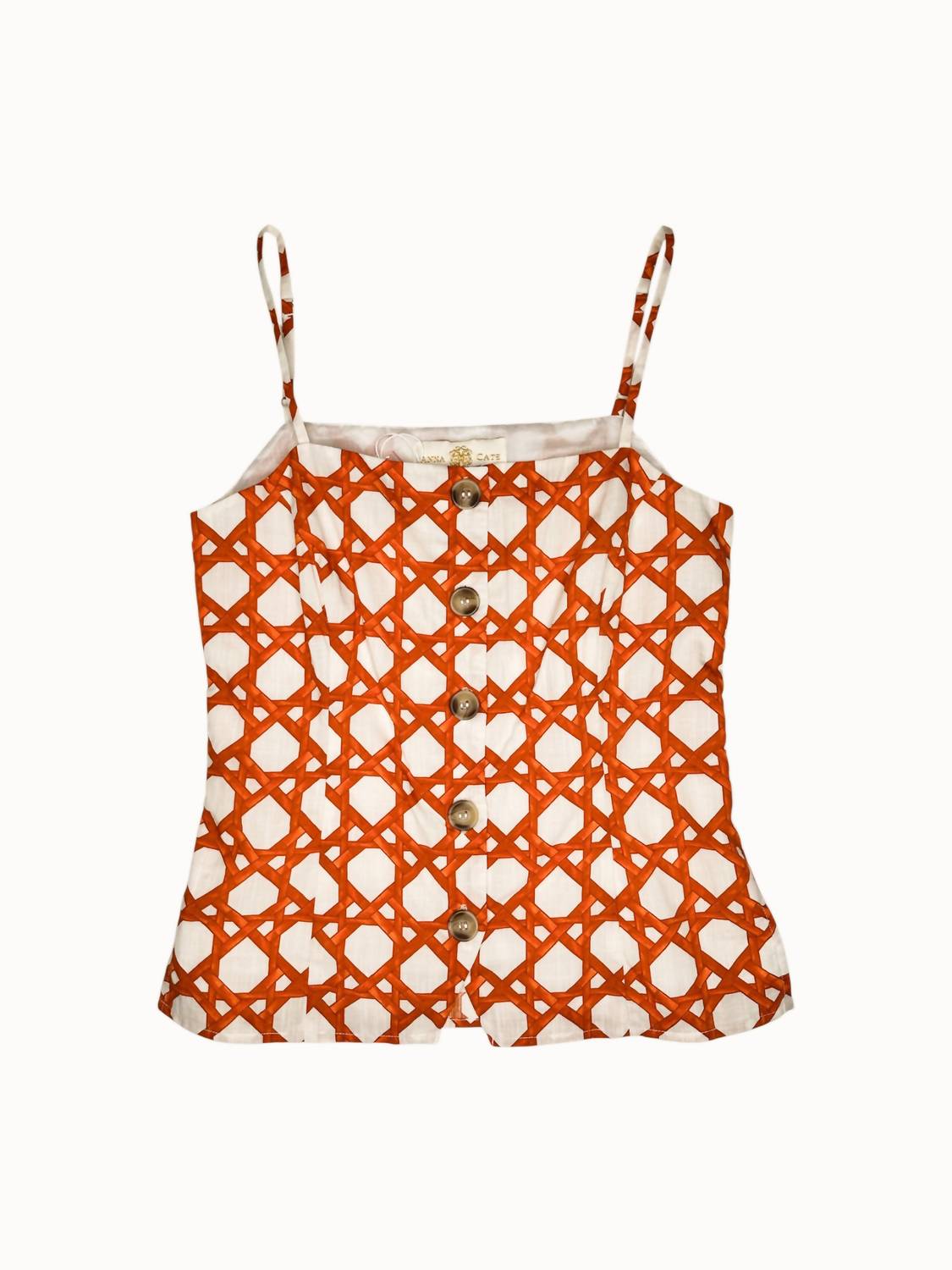 Elevate your game day ensemble with the Harris Tank by Anna Cate, featuring slender spaghetti straps and a chic button-down front in a playful Trellis pattern. Crafted from 100% cotton, this tank pairs effortlessly with the matching Lizzie shorts for a stylish coordinated look. Designed for summer and 4th of July festivities, the square neckline and whimsical print lend a touch of Boho Chic to any vacation occasion. Care for this garment with a steam iron to maintain its sophisticated yet spirited appeal.