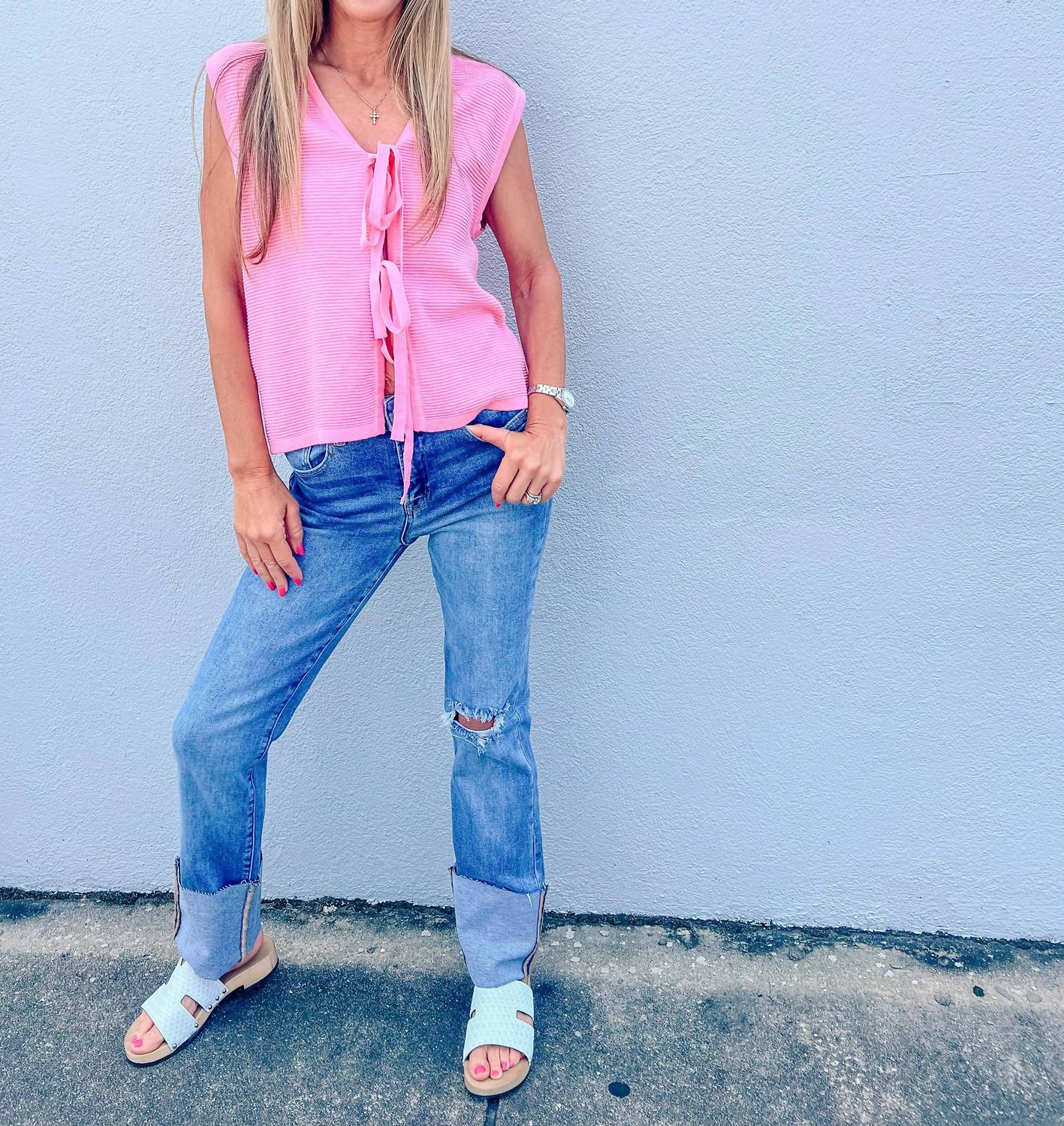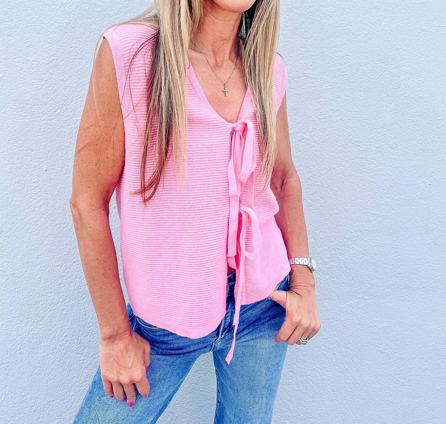 Embrace chic simplicity with the "In Love With You Sweater Vest" by AnnieWear, a must-have for your summer wardrobe. This pink, sleeveless vest boasts a playful front bow closure and a textured sweater knit crafted from 100% cotton for all-day comfort. Its relaxed fit features a flattering V-neckline, perfect for layering over a tank, tee, or button-down. Care: Hand wash cold and lay flat to dry. Available in four sizes (Small: USA 2-4, Medium: USA 6-8, Large: USA 8-10, X-Large: USA 10-12), it's ideal for minimalist trends and occasions like dinner parties or Easter celebrations.