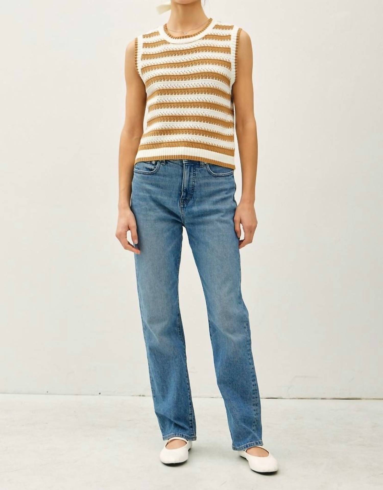 This classic tank top is perfect for layering and cute enough to wear on its own. Introducing the Striped Sweater Tank Top by Be Cool, a sleeveless tank in stylish mocha designed for contemporary elegance. This top combines a sophisticated blend of pointelle and chunky crochet knits in a striking stripe pattern, featuring a comfortable scoopneck for a chic look. Made from a fabric composition of 60% Cotton and 40% Acrylic, it offers a lightweight feel that’s perfect for layering across multiple seasons. Pull on. Hand wash only. Ideal for any stylish housewarming event, this versatile piece transitions seamlessly from warm to cooler months.
