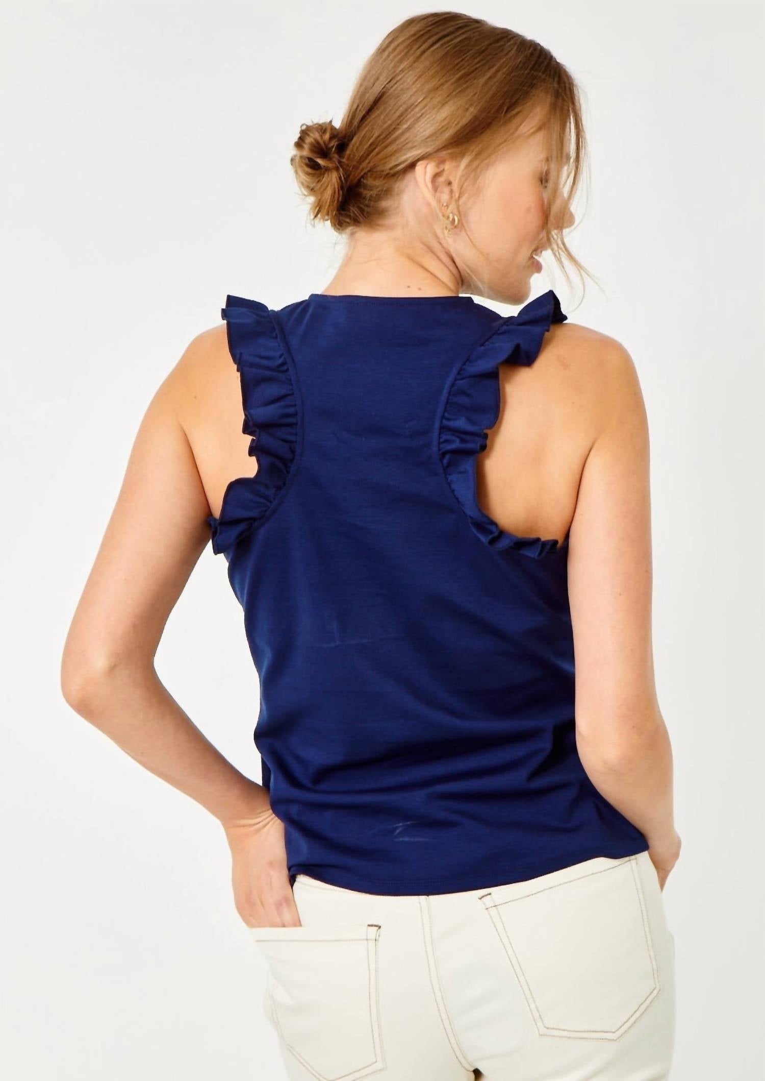 Discover the Alice Tank Top by Cartolina Nantucket, a chic addition crafted from a soft cotton blend in the eye-catching Ocean Cavern hue. This sleeveless top features flirty ruffle accents and a racerback design, perfect for versatile summer styles. The pull-on closure ensures ease of wear, making it ideal for a casual outing or a dinner party. Care is a breeze with machine washability, catering to your everyday fashion needs.