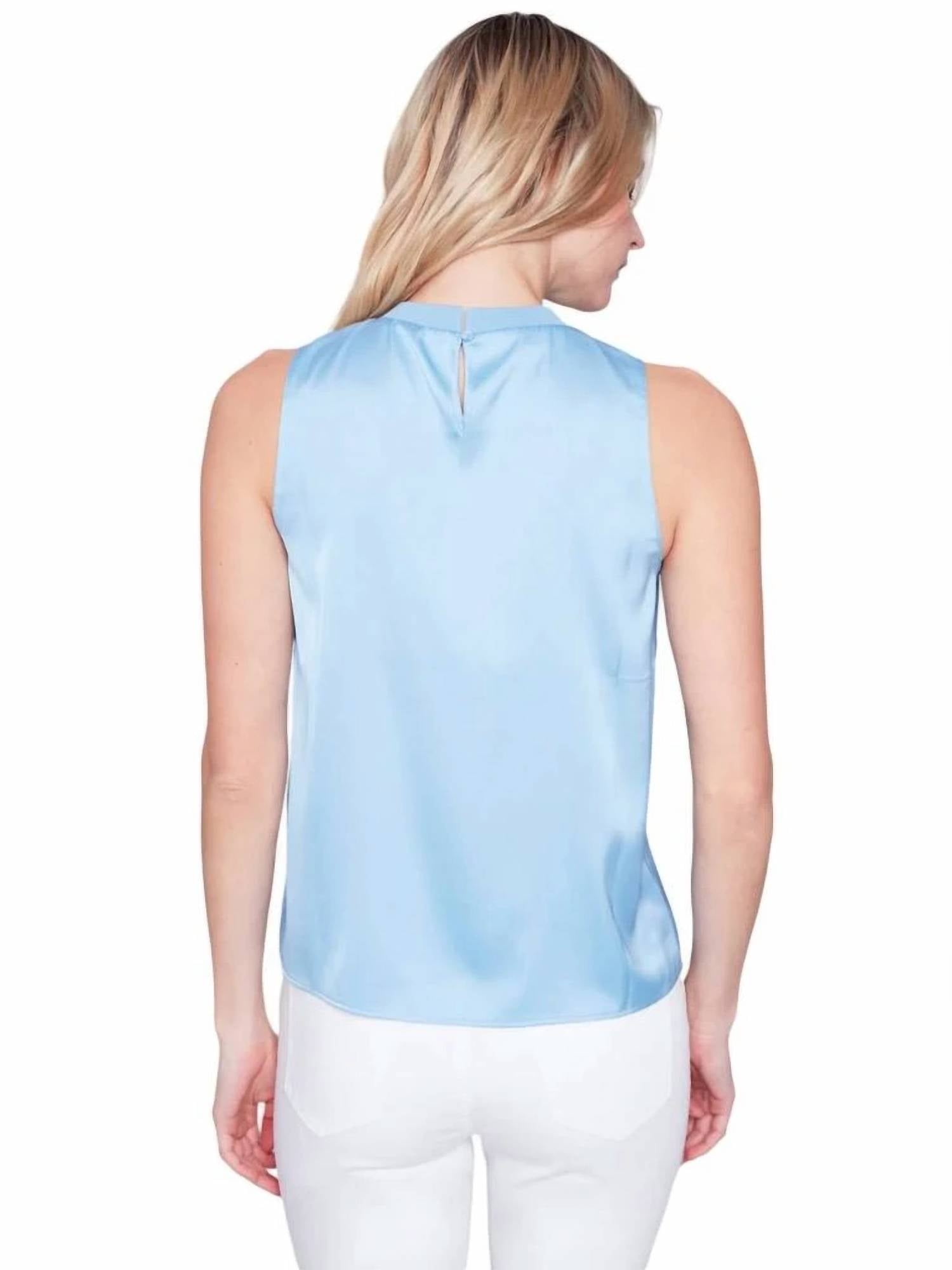 The perfect tank top for those warmer weather seasons. Elevate your spring wardrobe with the Ribbed Crew Neck Sleeveless Top by CHARLIE B, presented in an ethereal Sky hue. Crafted from 97% Polyester and 3% Spandex, this satin tank top offers a sleek fit and finish. With a back length of 23.5 inches, its minimalist design is accentuated by a rib neckband and tie closure. Perfect for a holiday party this Thanksgiving, its solid pattern offers versatile styling options.