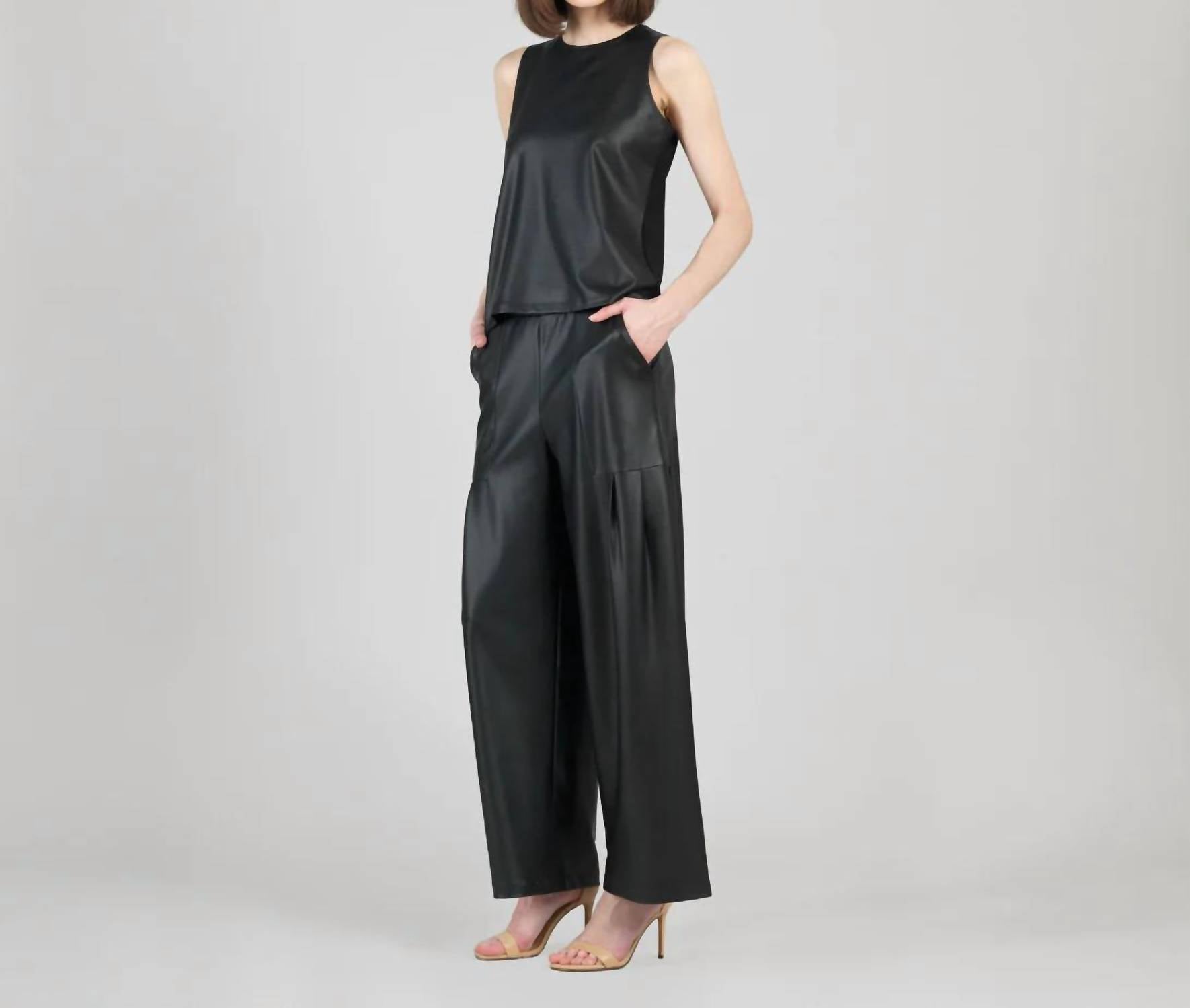 Elevate your style with the Liquid Leather High Scoop Modern Tank Top by CLARA SUNWOO, designed for the contemporary woman. This sleeveless tank top combines a vegan-friendly liquid leather front with a jersey-knit back, showcasing a soft-sheen finish and a flattering jewel neckline. Made from a flexible polyester blend, it offers a solid black look that is both ultra-lightweight and cool to the touch. Closure type is pull-on, and for care, simply hand wash and line dry.