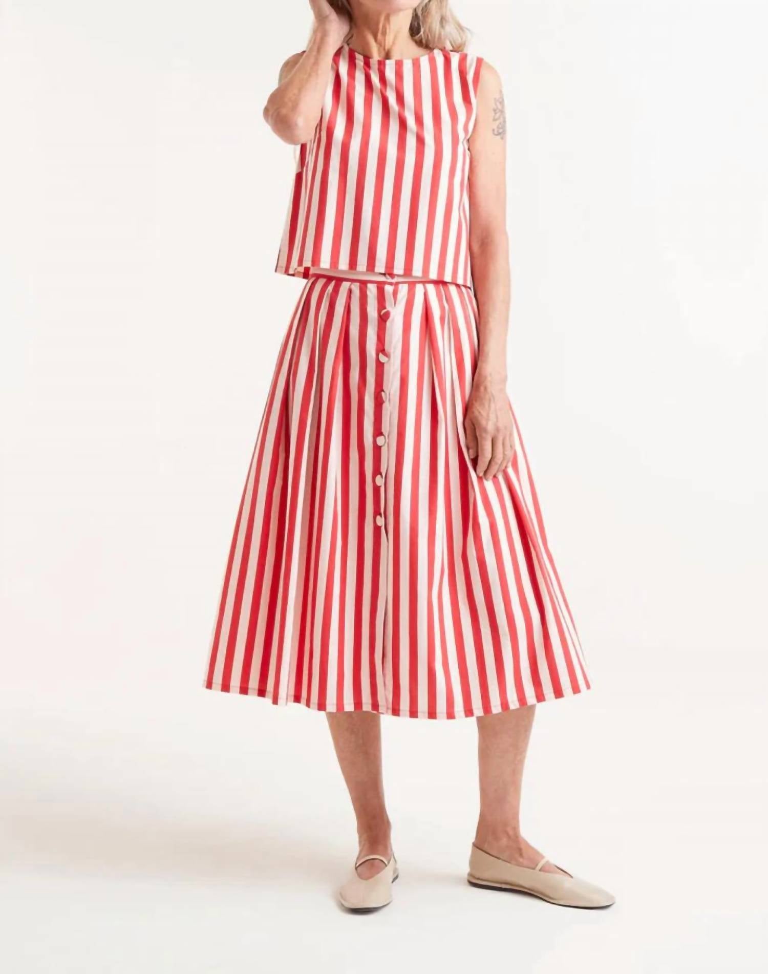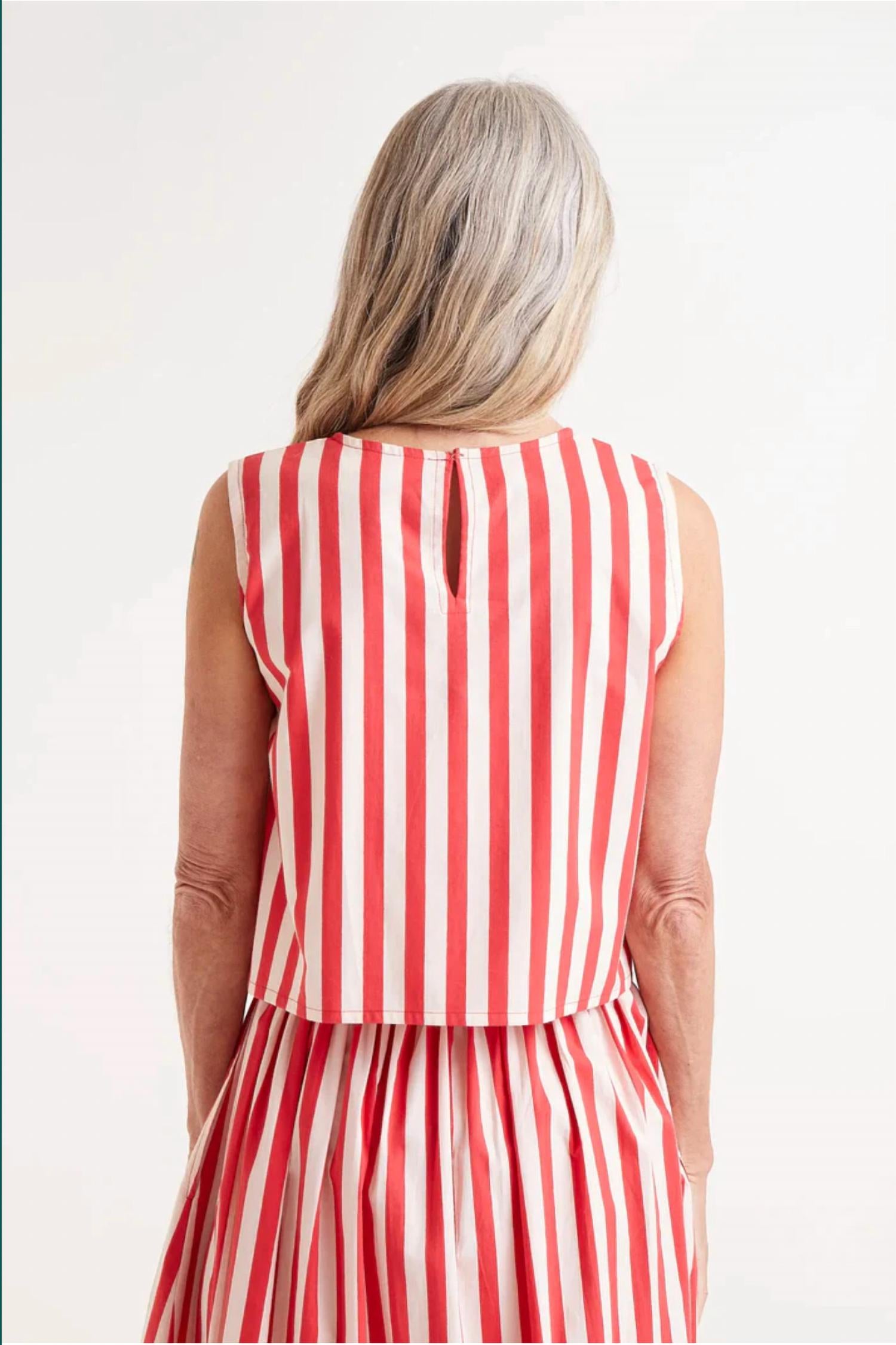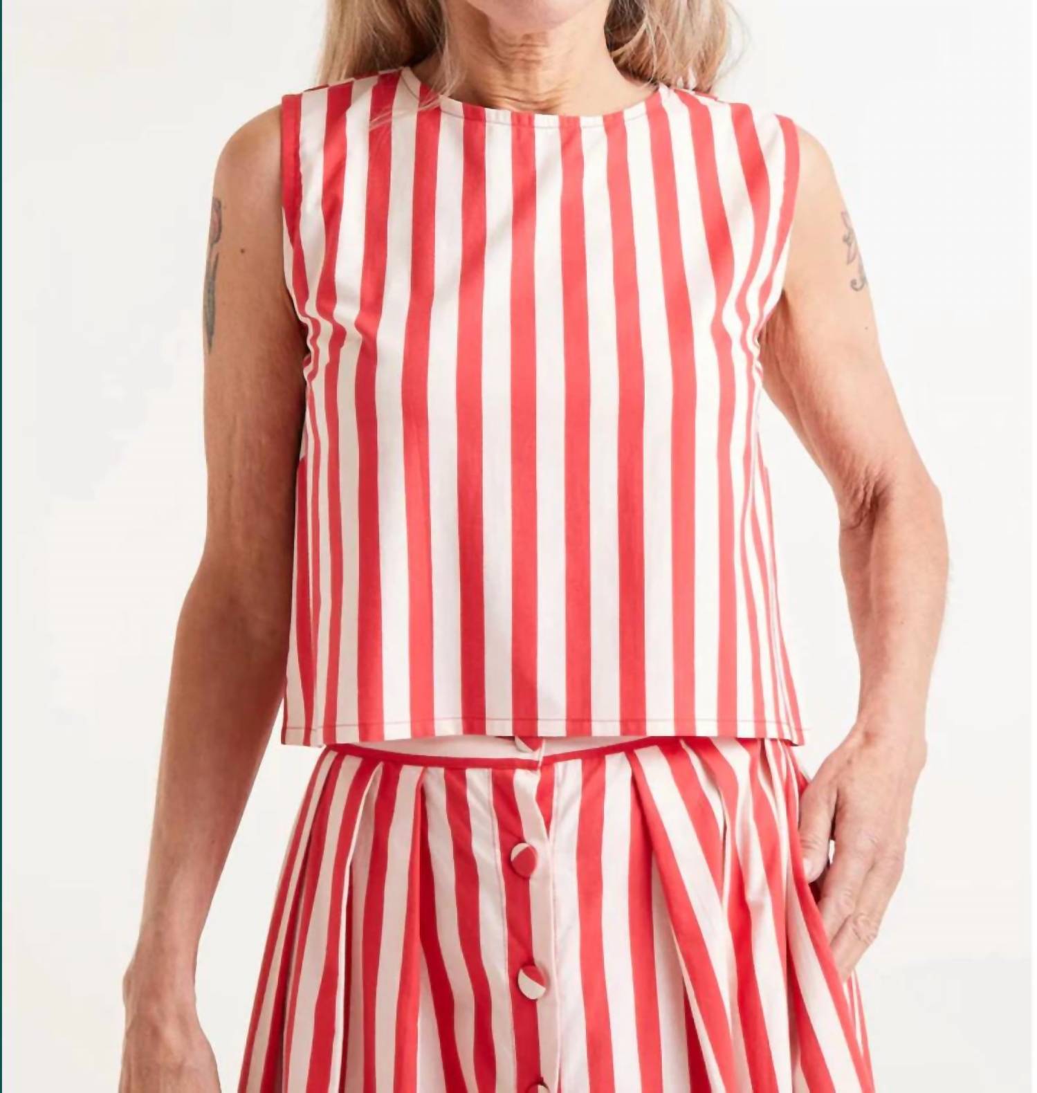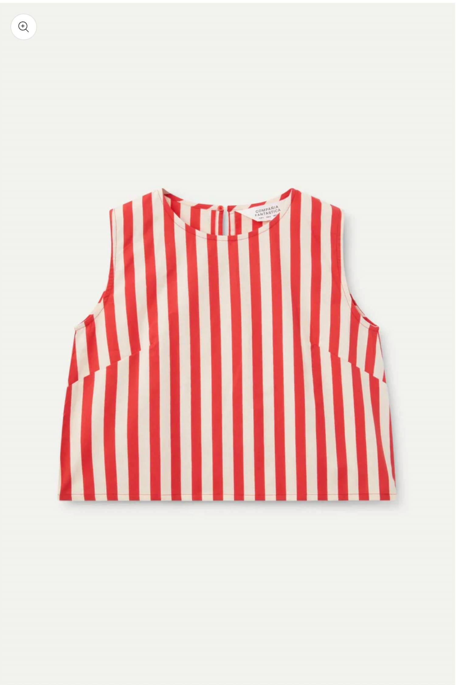 A regata perfeita para as estações mais quentes. A Regata Cabana da Compania Fantastica oferece um estilo descontraído para o verão com seu design sem mangas, confeccionada em algodão confortável com uma estampa divertida de listras vermelhas. A blusa possui gola redonda e fecho nas costas com fenda e botão para um toque elegante. Material: Algodão. Fecho: Botão. Perfeito para adicionar elegância casual a qualquer look para dias ensolarados.