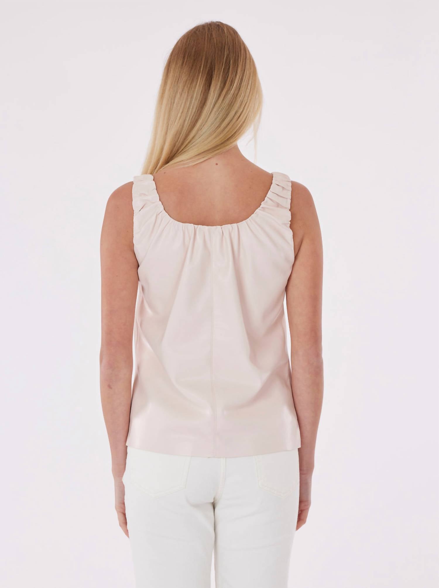 Esta regata clássica é perfeita para usar em camadas e é fofa o suficiente para ser usada sozinha. Regata de couro sintético. Decote franzido exclusivo. Perfil elegante. Versátil para uso diurno ou noturno. Combine com jeans ou saias para um look contemporâneo. Também combina bem com saias longas esvoaçantes para um toque romântico. 100% nylon. Lavar à mão com água fria.