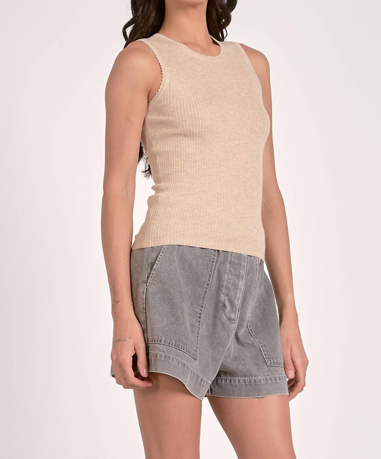 Presenting the ELAN Wendy Tank in Sand, a seamless blend of style and comfort perfect for any minimalist wardrobe. This sleeveless top highlights a ribbed, scooped neckline and a fitted cut to elegantly showcase your silhouette. Composition: 85% Polyester, 15% Polyamide. Made under fair working conditions in China. Closure: Pull on. Ideal for spring dinner parties.