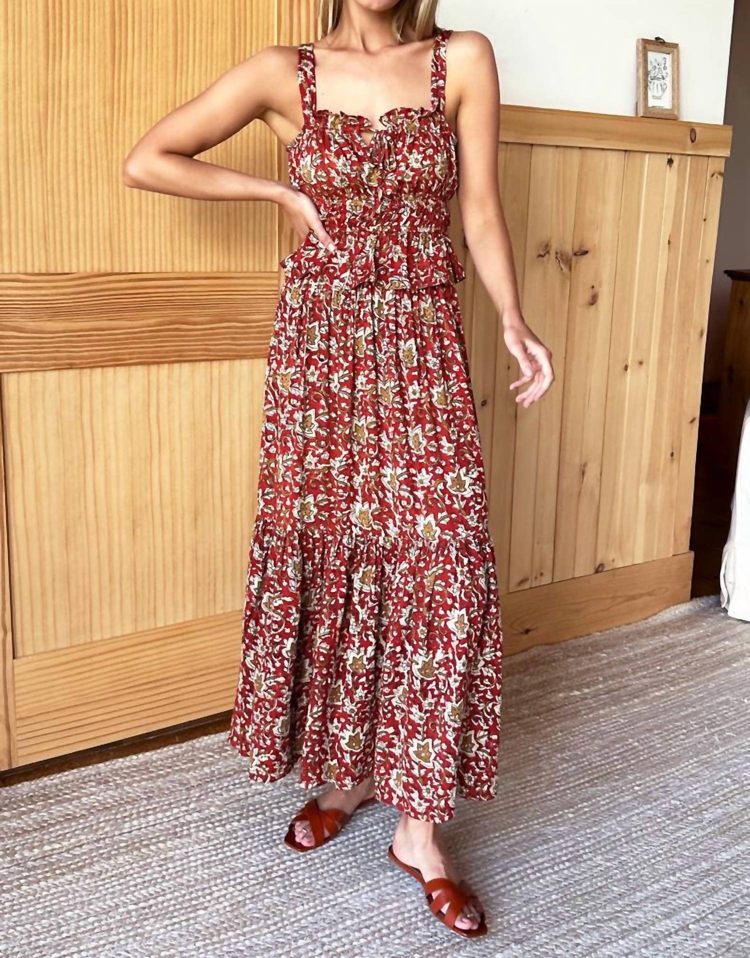 The perfect tank top for those warmer weather seasons. Elevate your summer wardrobe with the Pipa Sun Top by EMERSON FRY, a captivating sleeveless piece in Navi. This tank top showcases a luxurious Satin Modal material featuring a hand-block print with a boho chic flair. The design includes a ruffled square neckline and a keyhole opening with a tie, complemented by a shirred elastic waist for a flattering fit. Closure: Pull on styling.