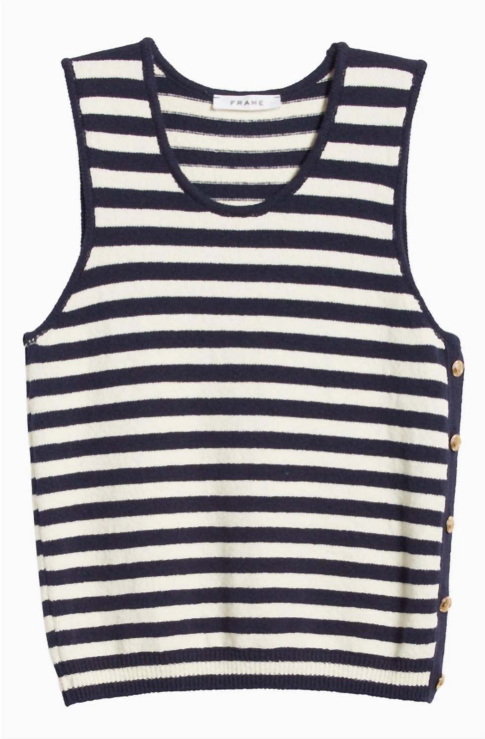 Fit, fabric and functionality. This tank top checks all the boxes. Embrace nautical allure with the FRAME Mariner Sweater Tank Top in Navy Multi, perfect for vacation wear. This sleeveless design in a chic stripe pattern features a 20" length and is accented with shiny anchor-emblem buttons for a coastal touch. Crafted with a cotton-blend composition of 75% cotton and 25% polyamide, this piece boasts a side button closure for easy wear. Care instructions include dry cleaning, and the top is imported.