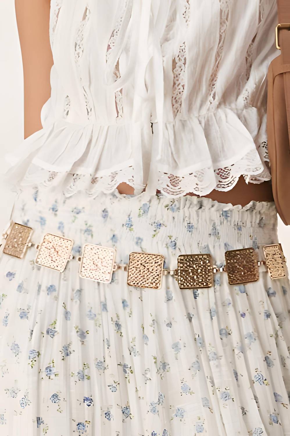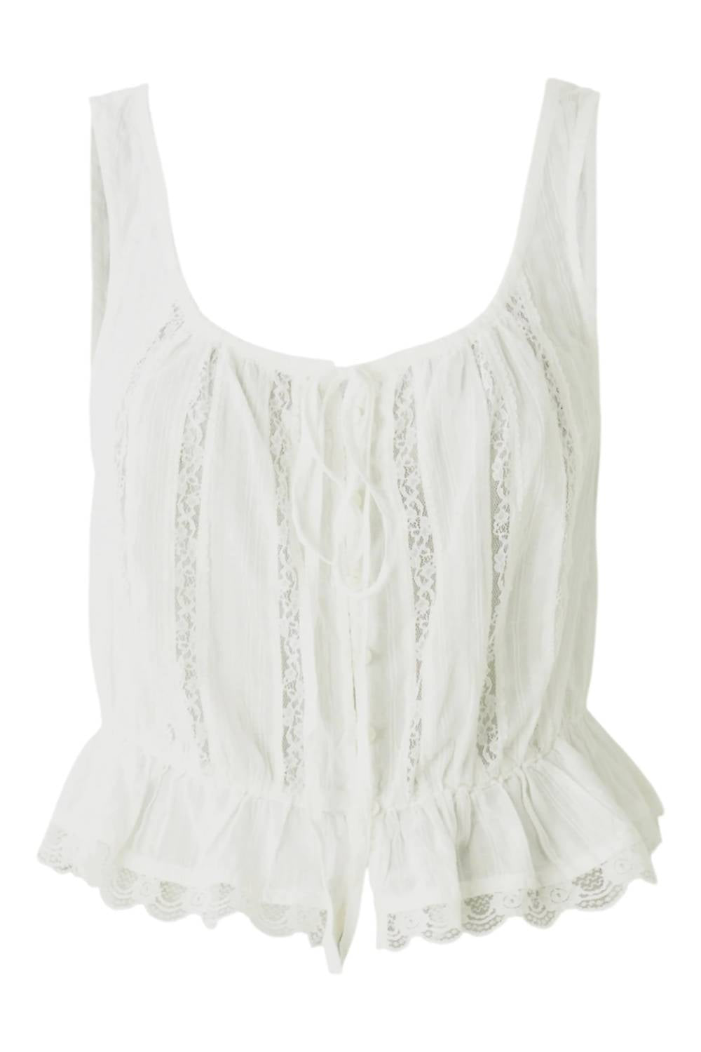 The Free People Alana Lace Tank in Ivory combines elegance and playfulness with its flirty cropped design and delicate lace texture. Crafted from 100% cotton, this sleeveless tank features a charming front tie closure and a cinched waist that enhances your silhouette. Perfect for summer outings, its v-neckline and ruffle hem add boho chic flair whether paired with high-waisted jeans, skirts, or breezy shorts. Care instructions include machine wash for effortless maintenance.