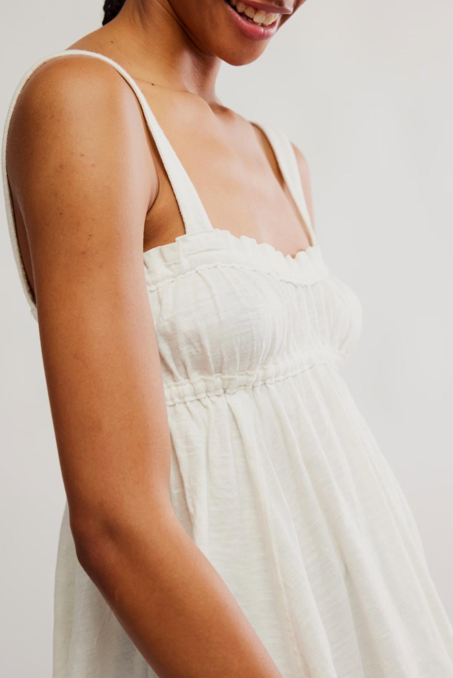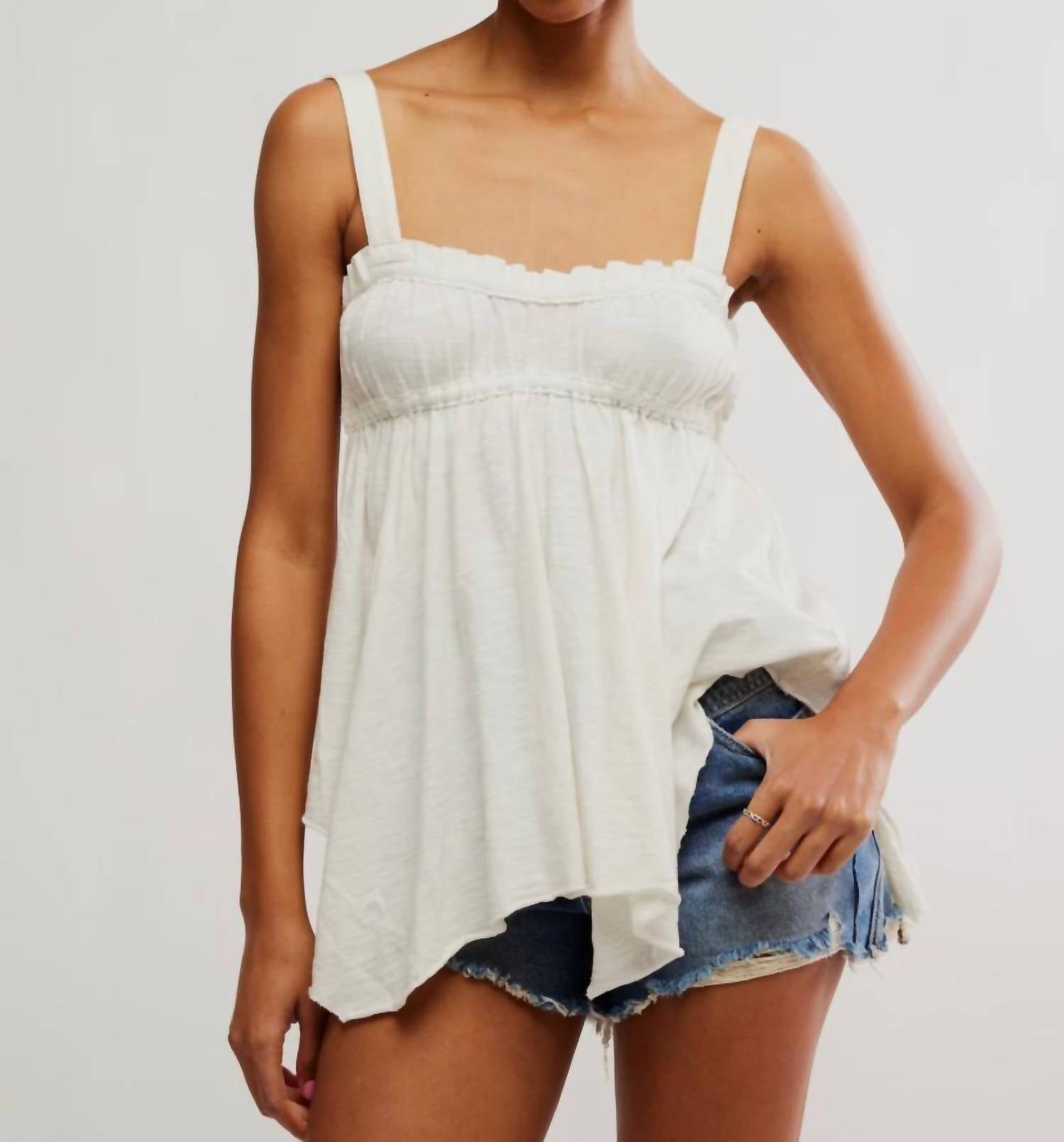 Discover the Amaryllis Tank Top by Free People, a must-have for any summer wardrobe in Ivory. This sleeveless tank is crafted from 100% airy cotton, featuring thick, fixed straps and a stylish square neckline accentuated by a ruched bust and ruffled trim. The longline design ends in a playful fairy hem, ensuring a flowy and feminine silhouette. Perfect for vacation or any Y2K-inspired outing, this top is easy to wear with its pull-on style and is conveniently machine washable.