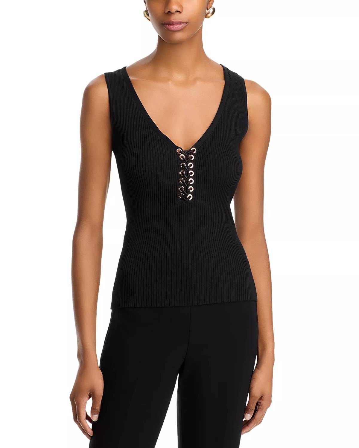 The perfect tank top for those warmer weather seasons. The Pacey V Neck Sleeveless Sweater by Generation Love, available in a sleek black, epitomizes minimalist chic. This textured, sleeveless tank top features an eye-catching lace-up grommet detail at the V-neck, offering a stylish twist to your wardrobe. Made from a comfortable 65% viscose and 35% nylon blend, this pullover style ensures a slim fit and effortless elegance. Crafted for vacation getaways and springtime pairing, it's imported and best maintained with a gentle hand wash. Model is wearing a size extra small (5'10" height, 33" bust, 25" waist, 35" hips).