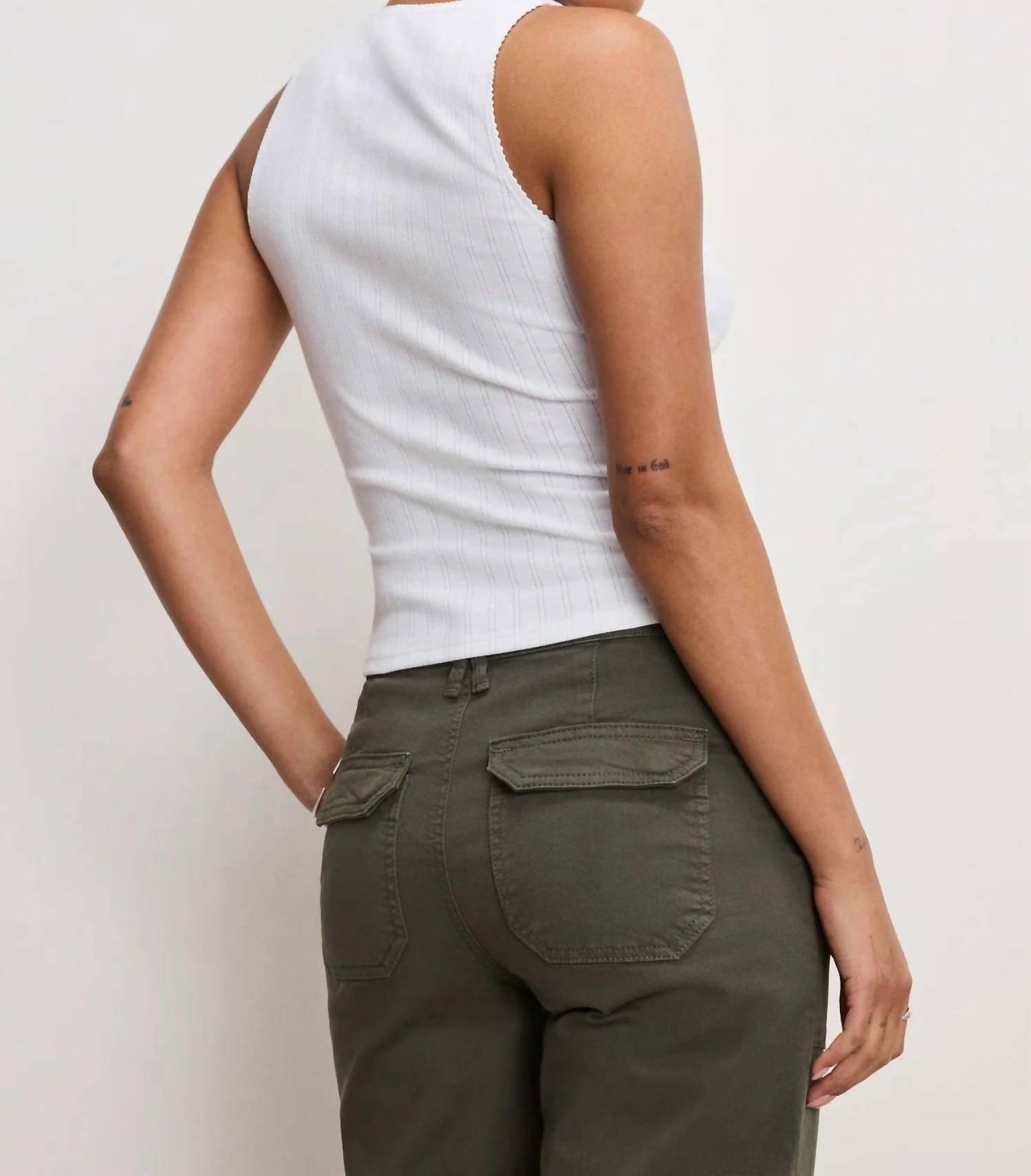 The perfect tank top for those warmer weather seasons. Introducing the Pointelle Henley Tank Top by GOOD AMERICAN, a staple for minimalist style in crisp white. This sleeveless top features a classic Henley button closure and a scoop neck, crafted from a blend of 62% recycled polyester, 34% cotton, and 4% elastane for added stretch and comfort. The delicate pointelle knit adds texture, making it perfect for layering or wearing alone on vacation-ready days. Care for this solid-patterned piece with ease by machine washing as needed.