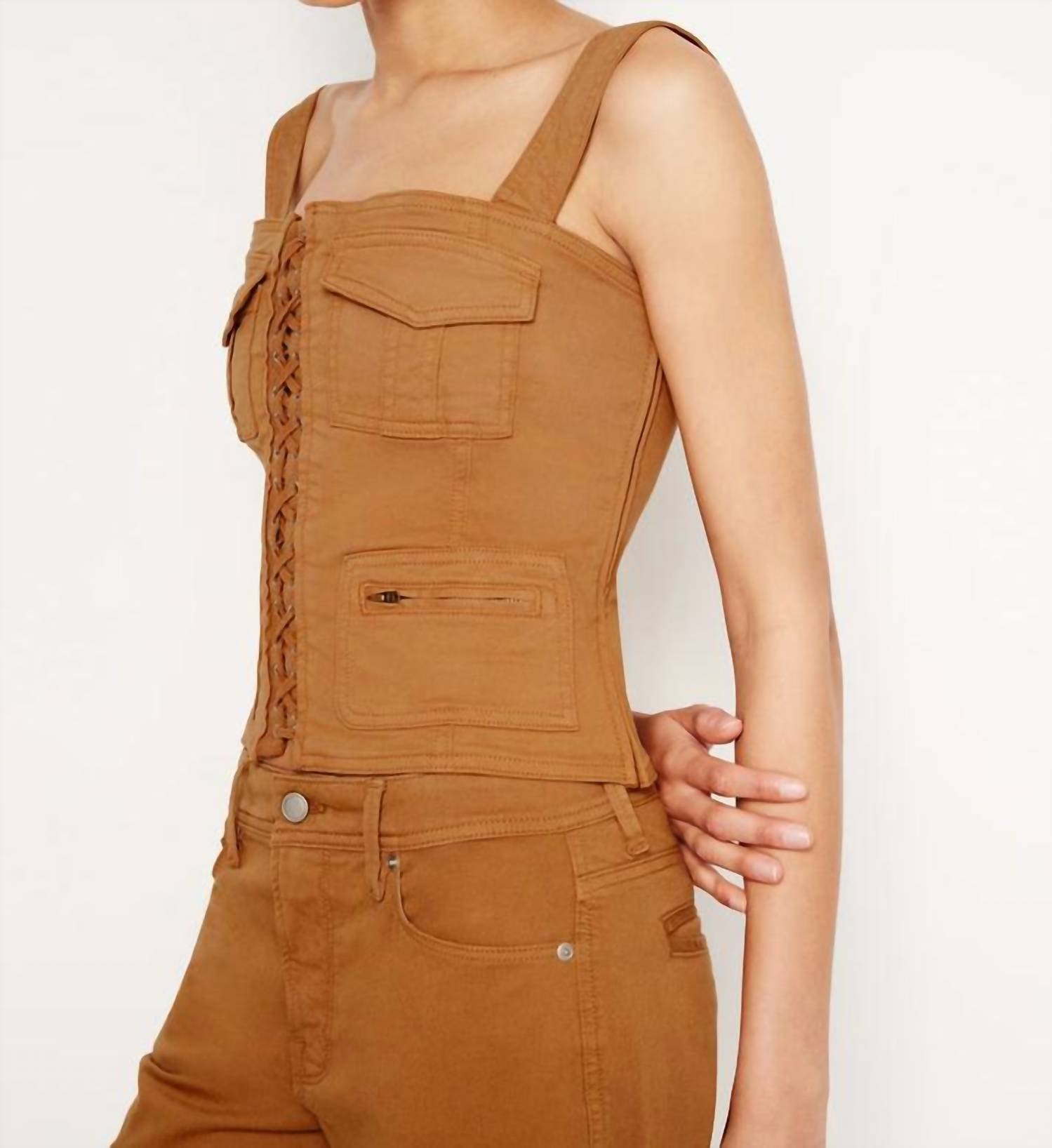 Caimento, tecido e funcionalidade. Esta regata preenche todos os requisitos. Apresentamos a regata Twill Lace Up da GOOD AMERICAN, um item essencial para qualquer guarda-roupa pronto para shows, em um tom marrom chique. Esta regata sem mangas possui alças largas e um decote quadrado diferenciado para um visual moderno. Confeccionada em uma mistura de algodão texturizado, inclui bolsos funcionais com aba no peito e bolsos frontais com zíper. Desenhada com fecho de zíper lateral para facilitar o uso, seu comprimento cropped realça seu visual urbano. Cuidados: Lavar à máquina e secar na secadora.