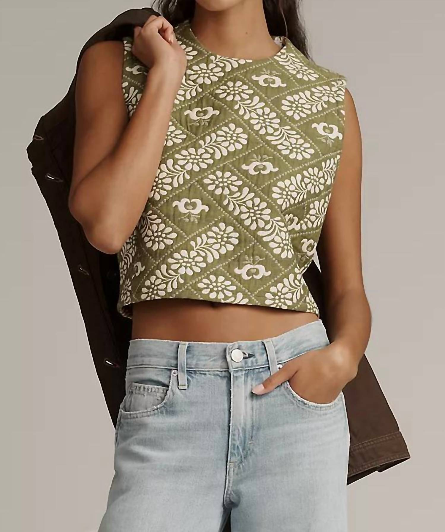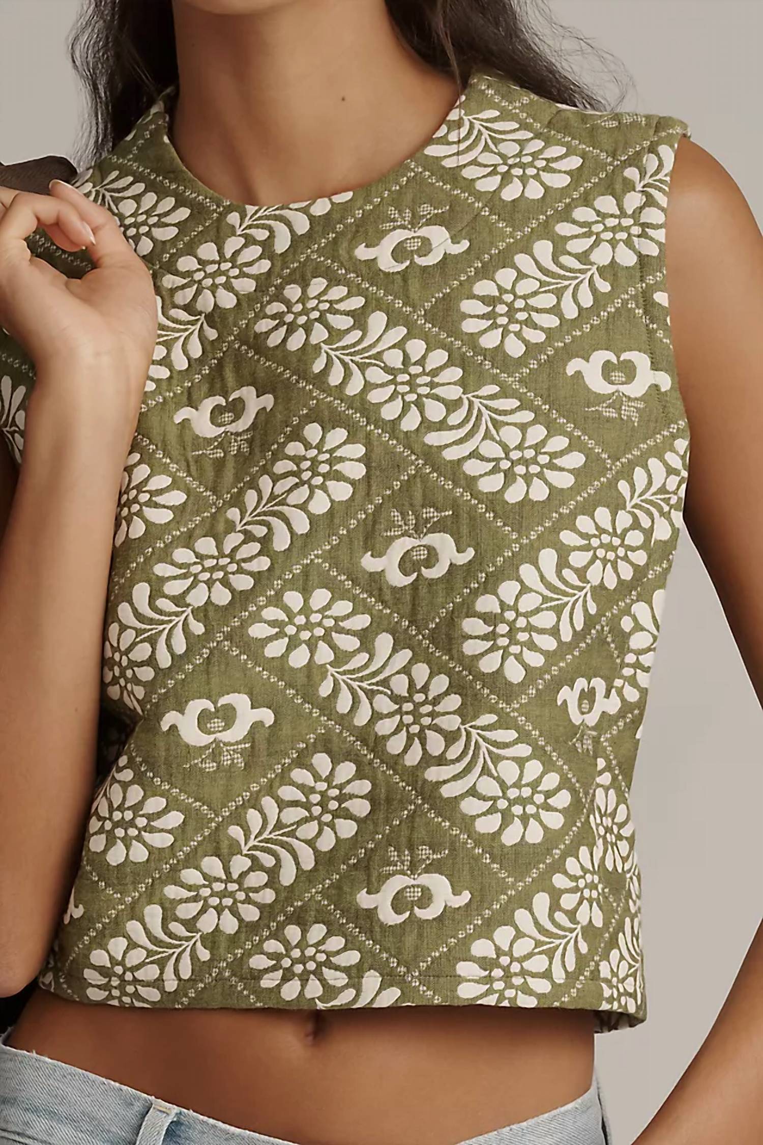 Fit, fabric and functionality. This tank top checks all the boxes. The Manning Crew Top by Hunter Bell is a striking addition to your wardrobe in Legacy Jacquard Olive. This patterned, sleeveless tank offers a unique blend of 62% polyester and 38% cotton for comfort and style. Featuring a crew neckline and a practical zip closure with added shoulder zipper and snaps for easy wear. It is recommended to dry clean this piece to maintain its quality.