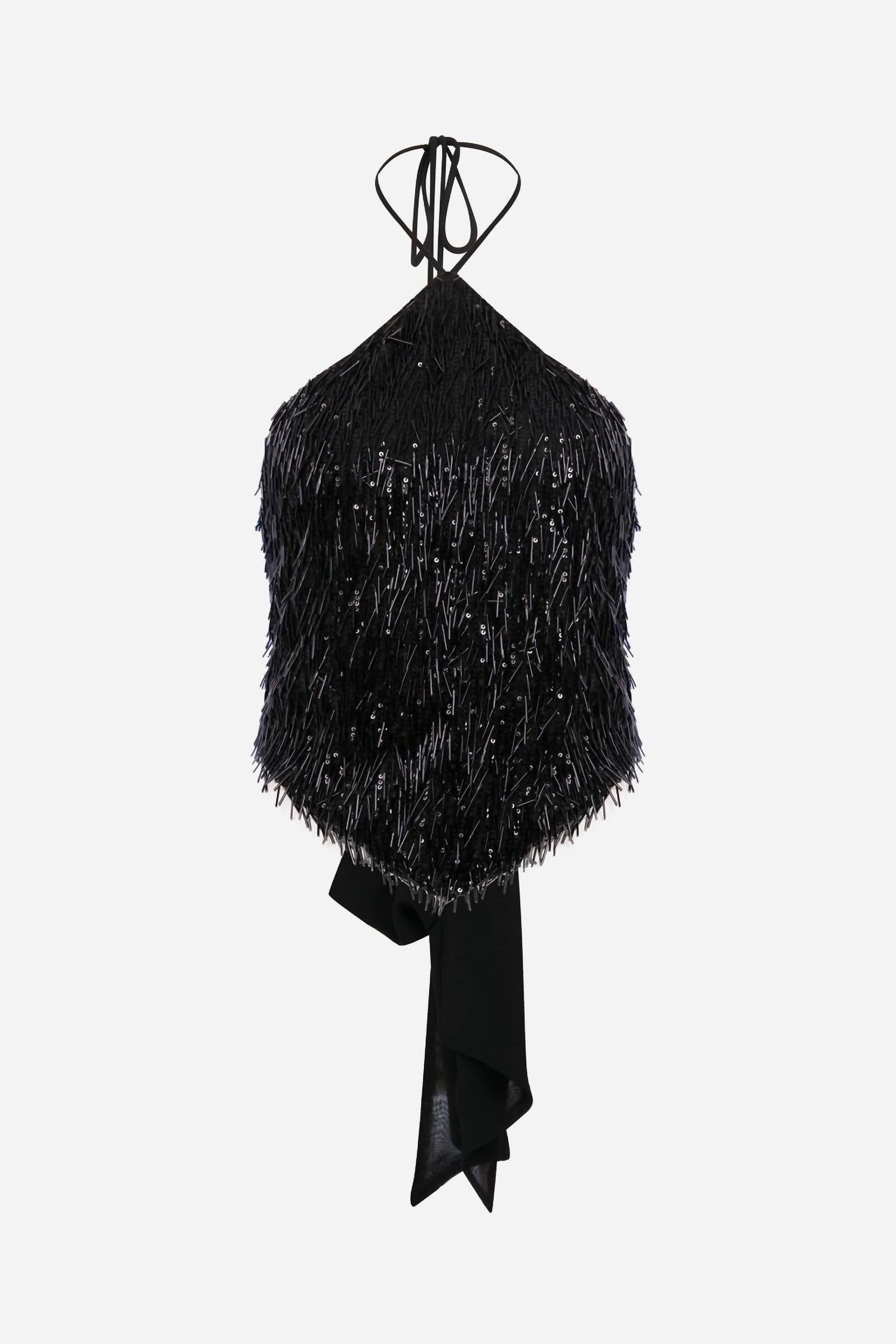 This classic tank top is perfect for layering and cute enough to wear on its own. Presenting the Alexa Bandana Sequin Top by ILA, a stunning black tank top perfect for making a statement. This piece features spaghetti straps and a stylish halter neckline, adding a touch of glamour with its sequined design. Made from 100% polyester, the top measures 18 inches in length and offers a tie closure for a secure fit. Care for this garment by adhering to dry clean only instructions.
