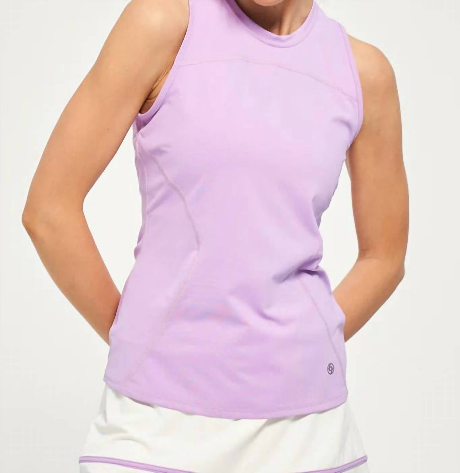 This classic tank top is perfect for layering and cute enough to wear on its own. Discover the Knit Pindot Tie Back Tank by Lija, a stylish addition to your workout wardrobe. This sleeveless top in Provence features a high crewneck and flattering princess seams for a body-skimming fit. Crafted in 84% Polyester and 16% Spandex, it offers a subtle pindot texture for added elegance. Closure: Tie closure at the back. Care: Hand wash. Perfect for minimalist fashion lovers, especially during spring workouts.