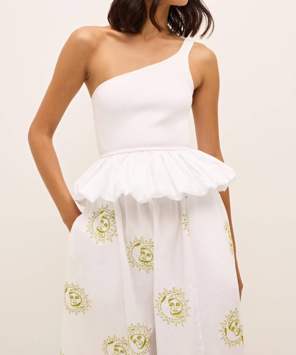 Apresentamos o Top Ruthie da Marie Oliver, uma peça estilosa perfeita para o seu guarda-roupa de férias de verão. Este design de ombros descobertos e técnica mista apresenta um corpete de malha canelada feito de uma mistura de viscose, complementado por uma bainha peplum de popeline de algodão dramática. Na cor Branco Frio, tem uma silhueta pull-on que o torna elegante sem esforço. As instruções de cuidado recomendam lavar à mão com um detergente suave e secar na horizontal para melhores resultados.