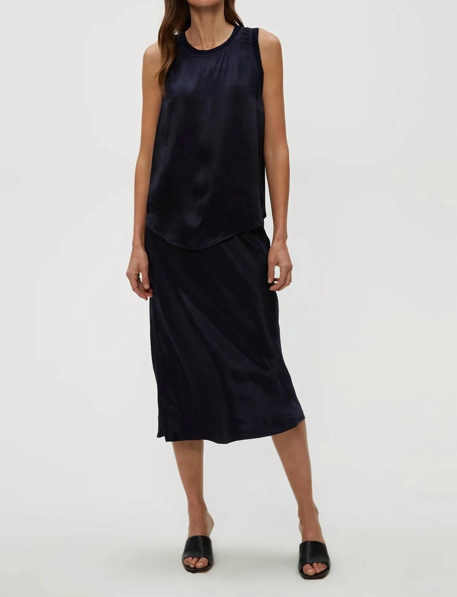This classic tank top is perfect for layering and cute enough to wear on its own. The Shay Binding Tank by Michael Stars is a sleeveless staple perfect for transitioning from day to night. Made in LA, this Nocturnal-hued tank is crafted from a luxurious satin blend of Rayon and Viscose, offering a flattering, loose fit with ribbed details and a curved hem for added elegance. Closure type: Pull on. Care instructions: Hand wash and line dry.
