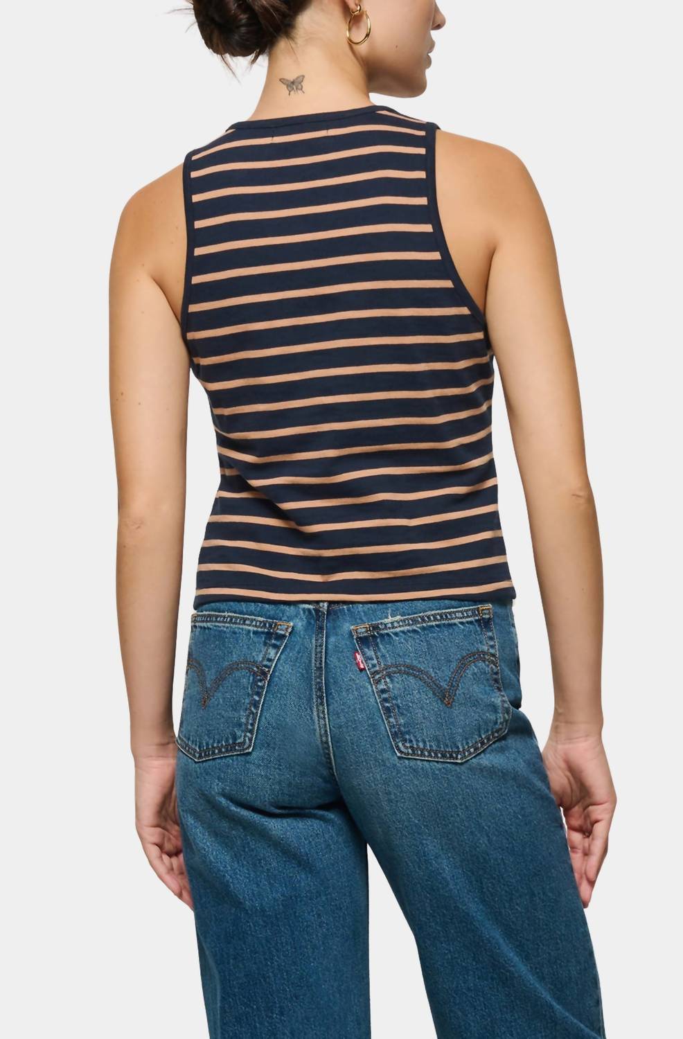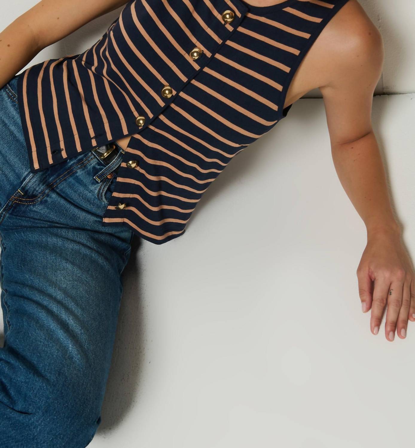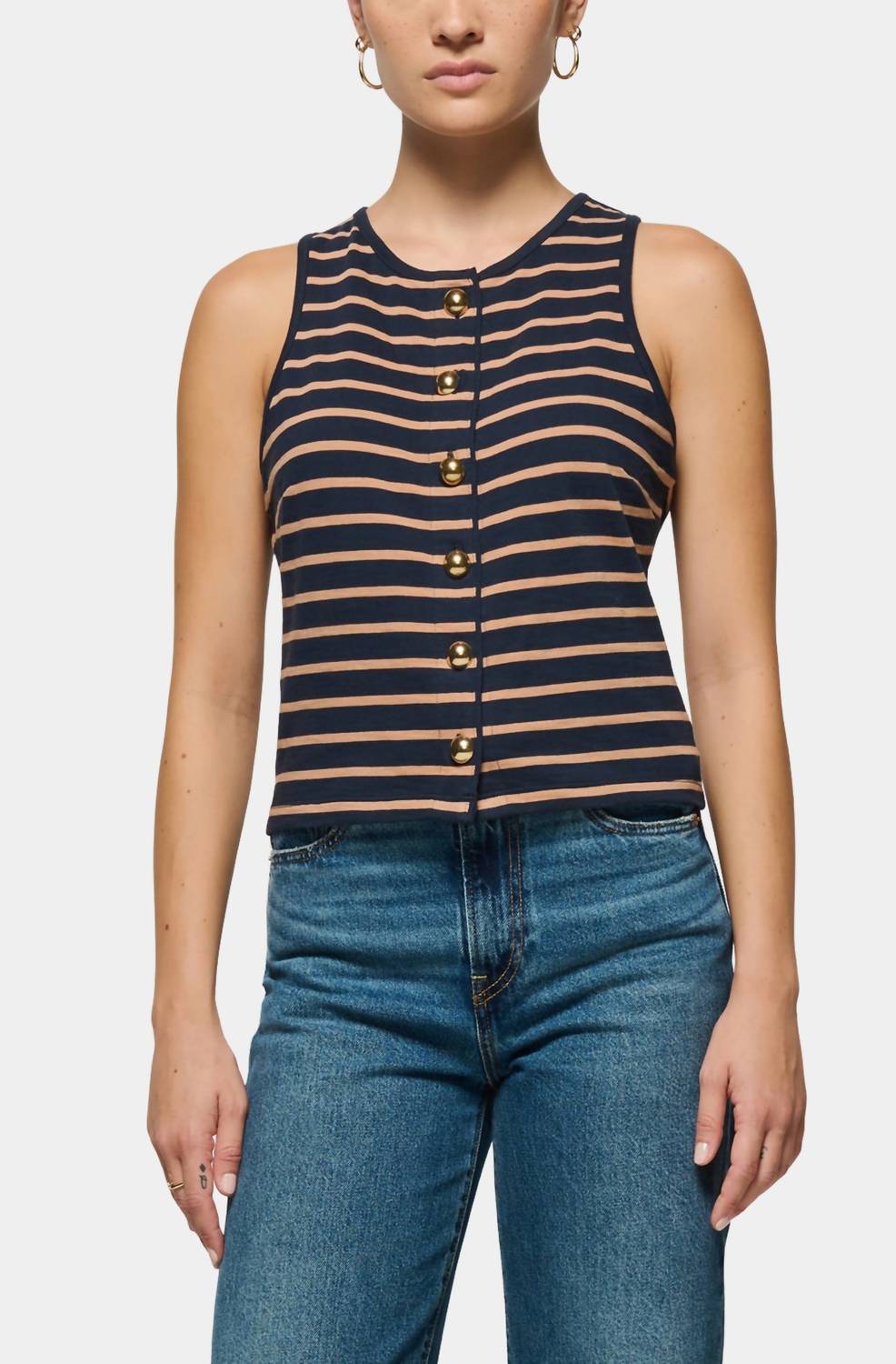 The perfect tank top for those warmer weather seasons. Meet the Abbie Tank by Nation LTD, a must-have for your summer wardrobe with its chic Latte Stripe pattern. This sleeveless top is crafted from high-quality 100% Peruvian Cotton, ensuring both comfort and style. Designed with a crewneck and a functional button closure adorned with Italian gold buttons, it effortlessly transitions from day to night. For care, machine wash and line dry to maintain its minimalist elegance.