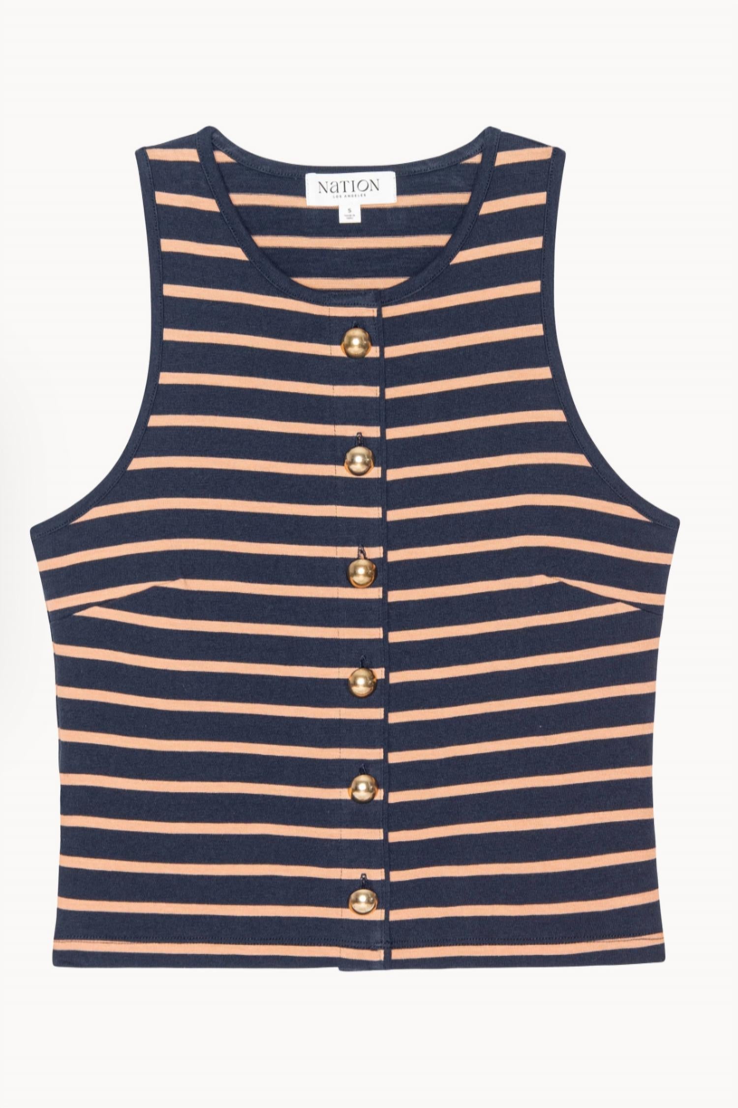 Meet the Abbie Tank by Nation LTD, a must-have for your summer wardrobe with its chic Latte Stripe pattern. This sleeveless top is crafted from high-quality 100% Peruvian Cotton, ensuring both comfort and style. Designed with a crewneck and a functional button closure adorned with Italian gold buttons, it effortlessly transitions from day to night. For care, machine wash and line dry to maintain its minimalist elegance.