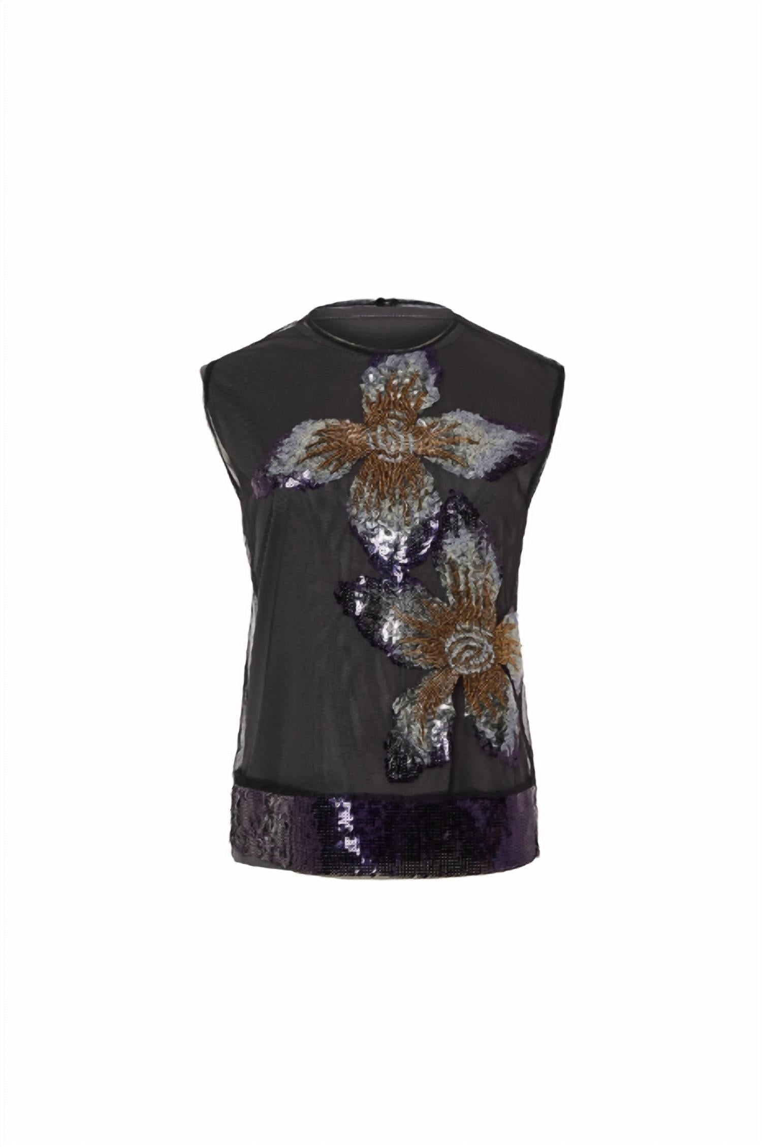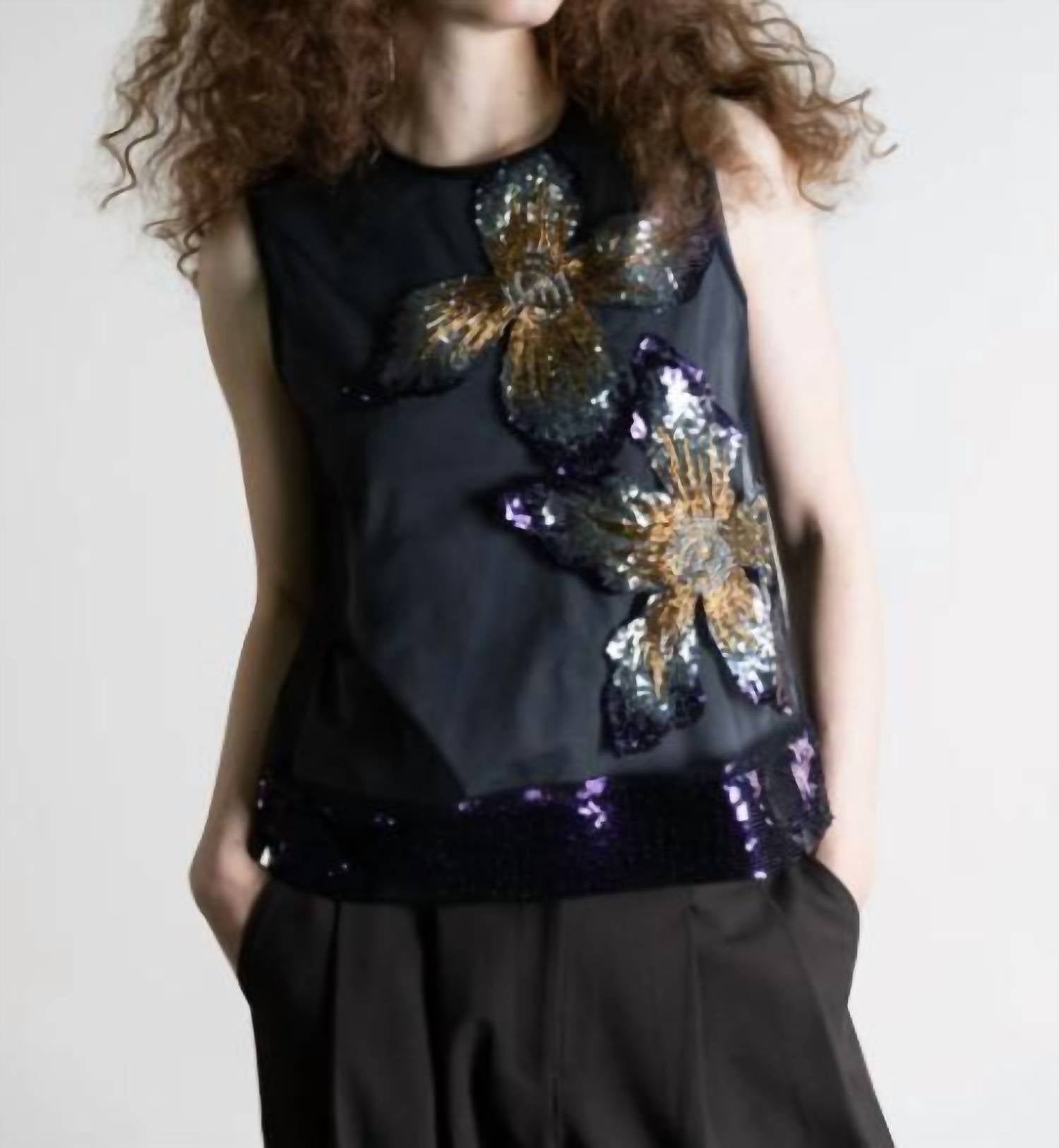 Fit, fabric and functionality. This tank top checks all the boxes. Experience the sophisticated allure of the Applique Tank Top by Psophia, crafted in Berry for a striking, romantic aesthetic. This sleeveless piece is made from sheer black tulle and features artistic floral embroidery in gold, silver, and purple sequins, offering a contemporary expression of elegance. Structured yet lightweight, its wide hem adds visual interest with contrasting sequins, making it perfect for high dress code events or couture-inspired looks. Closure is pull-on. Ideal for celebrating in style, this top effortlessly combines powerful femininity with creative design.