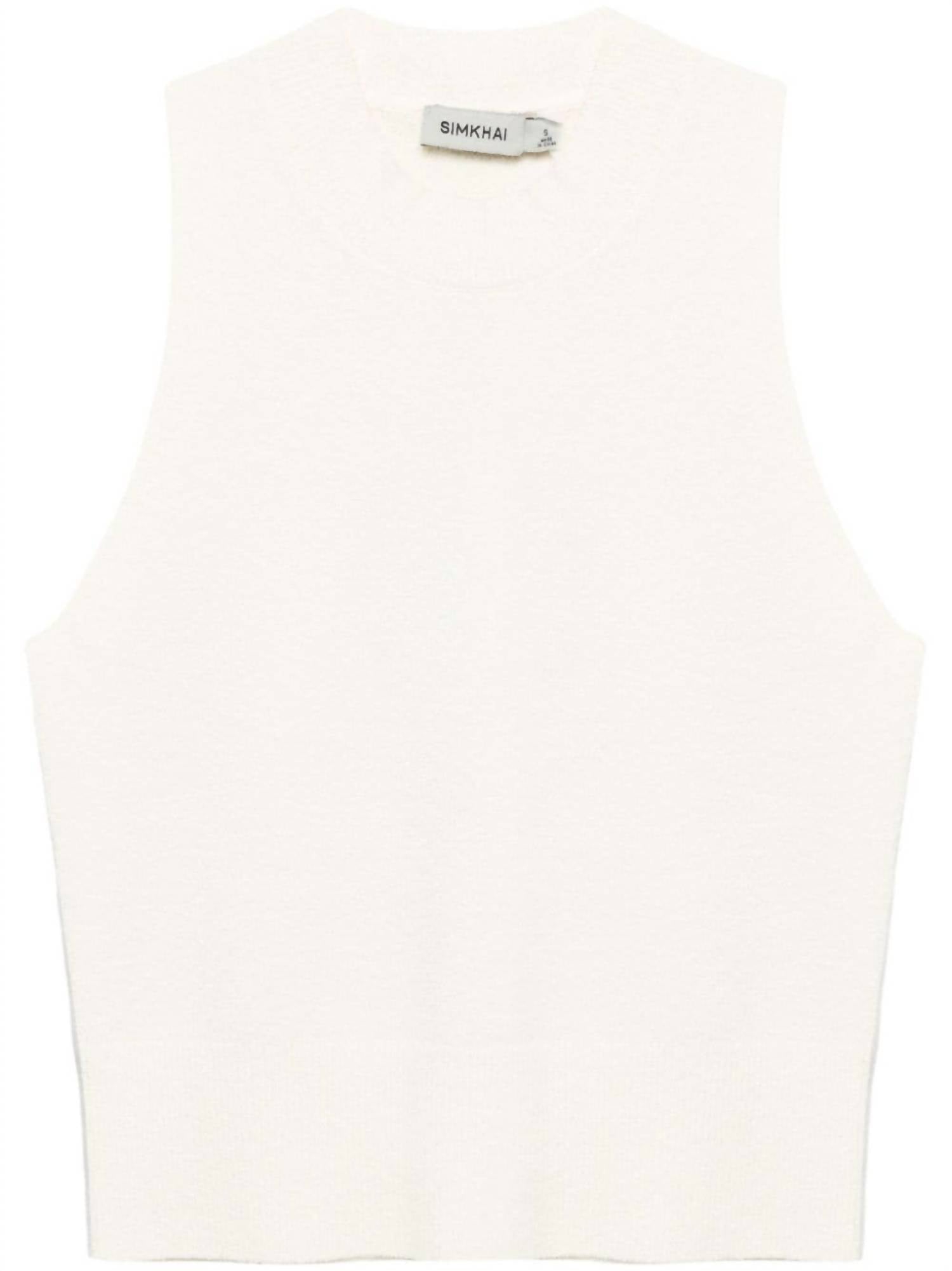 Elevate your summer wardrobe with the Tatyana Tank Top by SIMKHAI, an elegant sleeveless piece in chic ivory. Designed with a crewneck, this top features a cropped length and is made from a notable 71% Rayon, 28% Nylon, and 1% Spandex blend, offering a smooth, streamlined look. Manufactured overseas, the pull-on closure contributes to its minimalist appeal, perfect for vacation getaways. Care for this sophisticated top by hand washing and line drying to maintain its pristine condition.