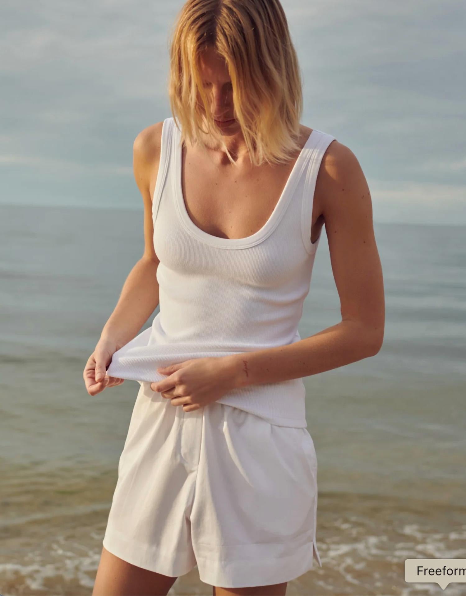 Fit, fabric and functionality. This tank top checks all the boxes. The Scoop It Up Tank Top by Sold Out NYC is a staple in sleek white, perfect for athleisure and vacation wardrobes. This sleeveless top is crafted from luxurious ribbed cotton, featuring a flattering scoop neckline and back. Designed for easy styling, the pull-on closure makes it seamless to wear alone or layered under outerwear
