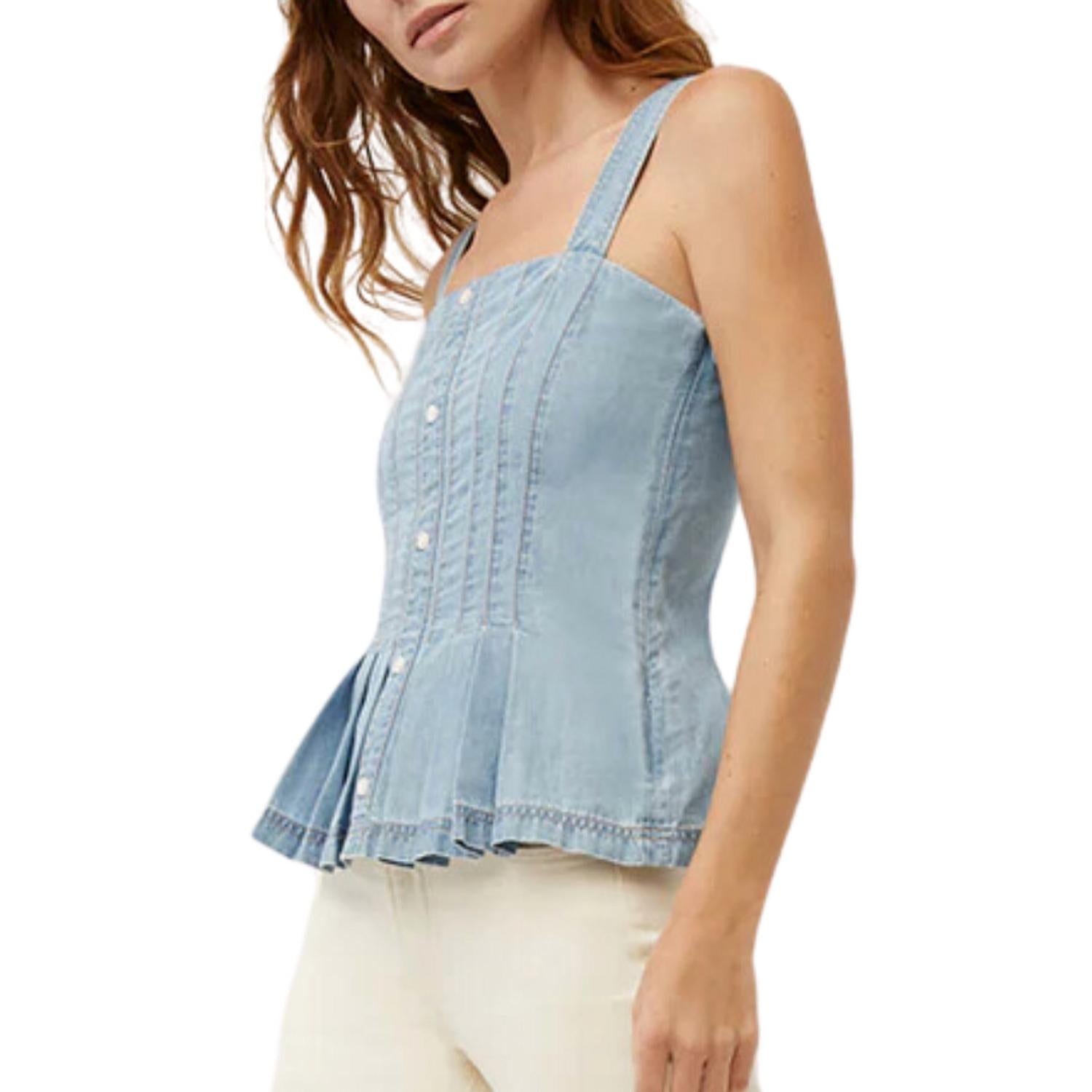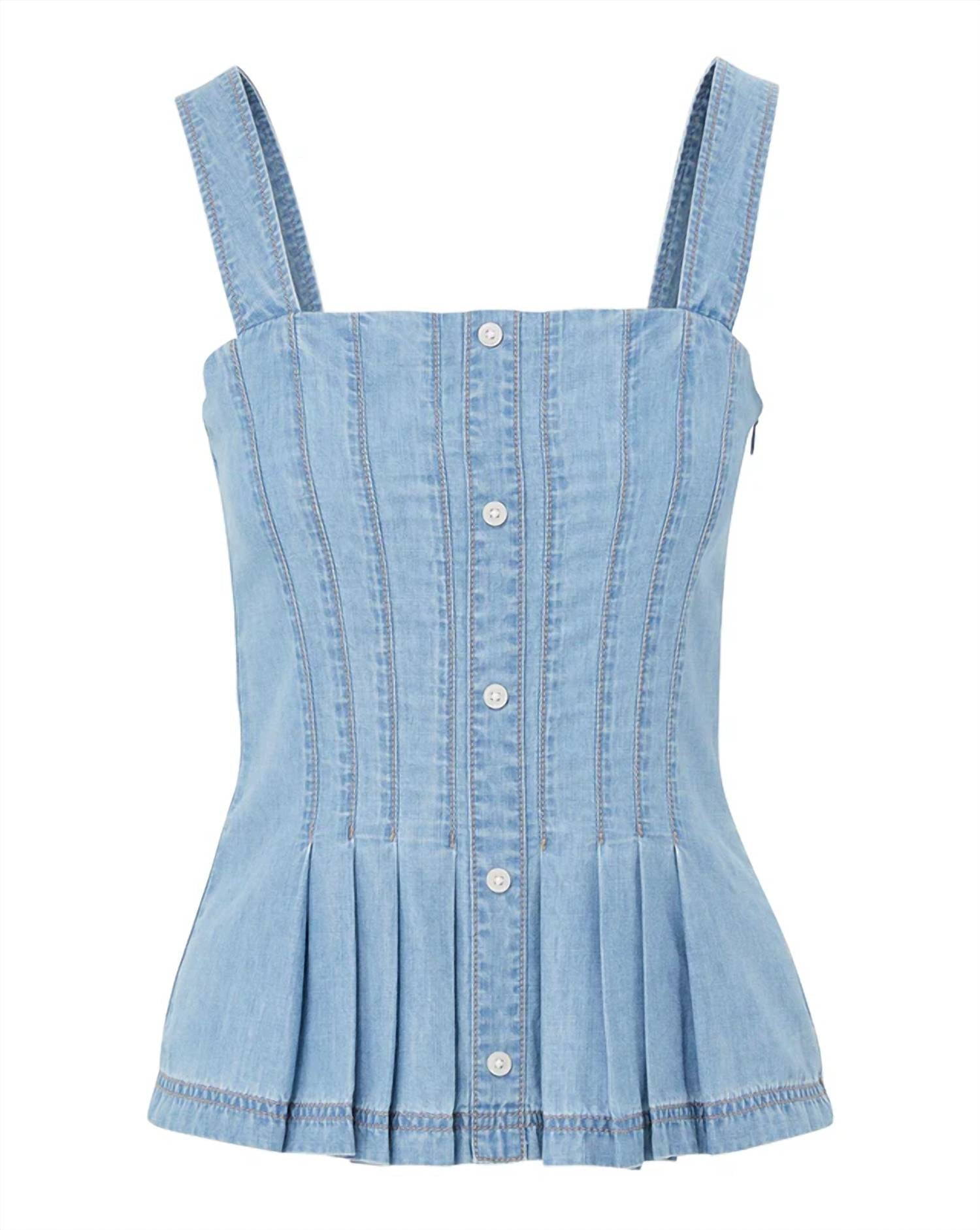 Caimento, tecido e funcionalidade. Esta regata atende a todos os requisitos. Apresenta diversas costuras na cintura que criam uma bainha peplum plissada, alças resistentes e fecho frontal com botões. Tecido: 60% algodão, 40% tencel. Lavagem à máquina com água fria. Comprimento: 36 cm.
