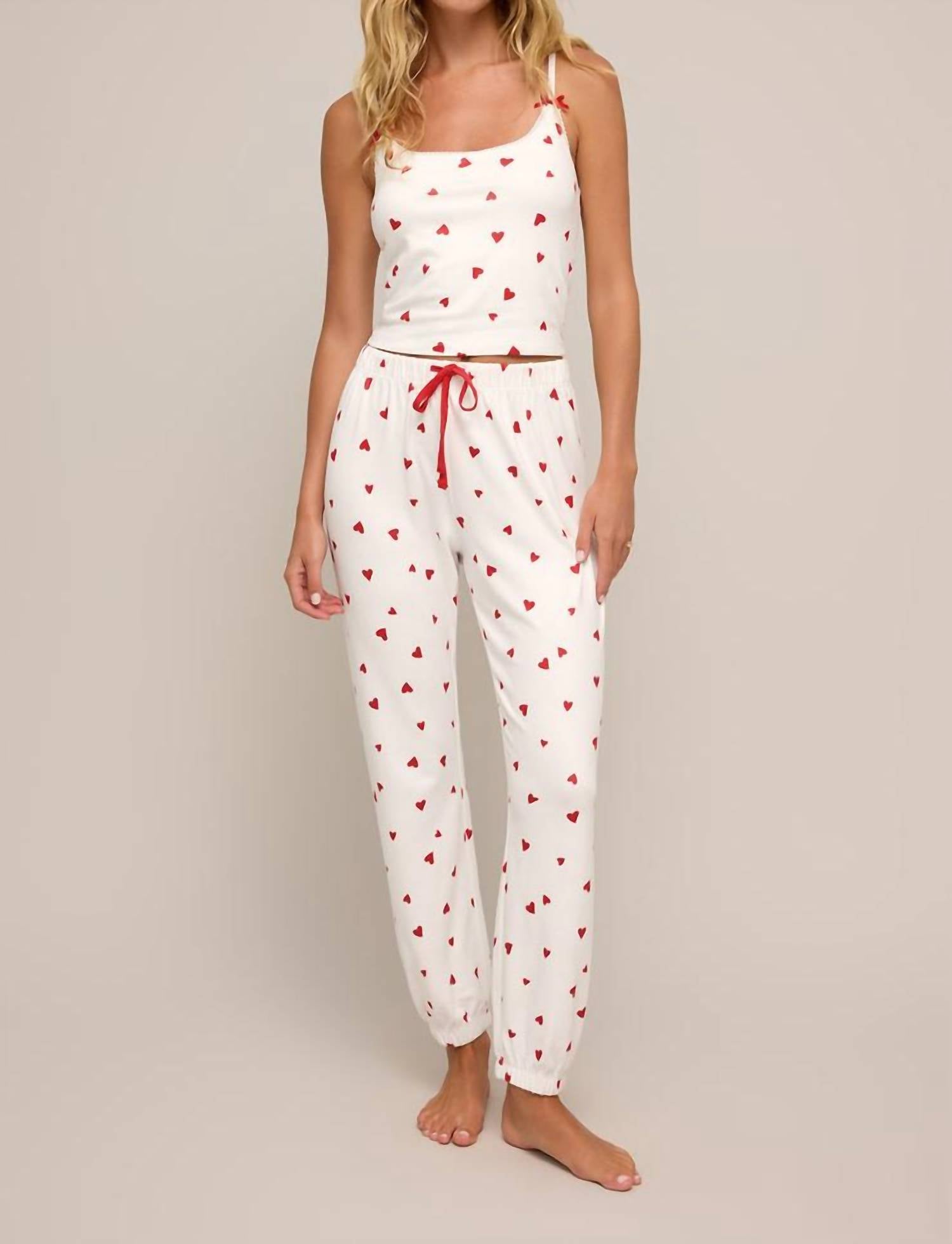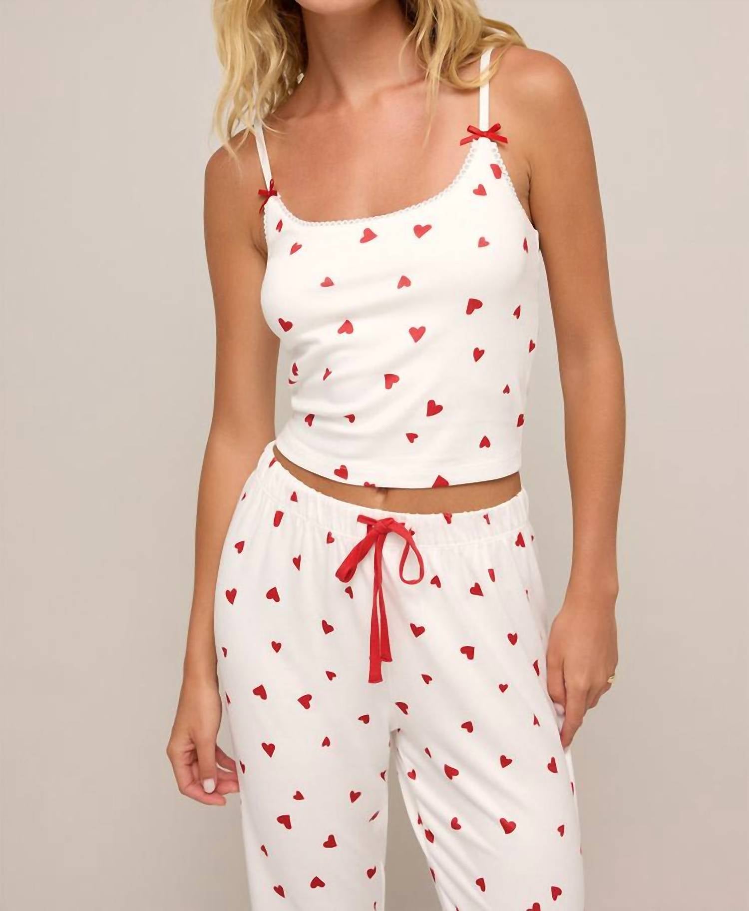 Esta camisola apresenta uma estampa de corações por toda a peça e delicados detalhes de laços nas alças ajustáveis. Possui decote redondo, modelagem sem mangas, alças finas ajustáveis e sutiã com alças finas. Confeccionada em 95% poliéster e 5% elastano. Lavar à máquina com água fria, ciclo delicado, secar em temperatura baixa ou esticar na horizontal.