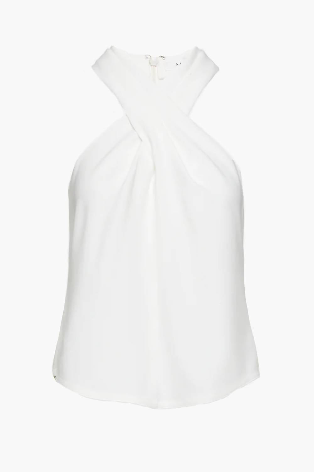 Pair this with your favorite jeans and slides for your next girls night out. Discover the Quinn Sleeveless Top by A.L.C., a chic addition to your wardrobe in a timeless white. Crafted with 70% Triacetate and 30% Polyester, this overlapping halter silhouette showcases sophisticated topstitch detailing and a convenient zip closure at the back. Perfect for any occasion, this sleek design can be elevated with statement accessories or dressed down with casual denim. Please note, this elegant piece requires dry cleaning to maintain its pristine condition.