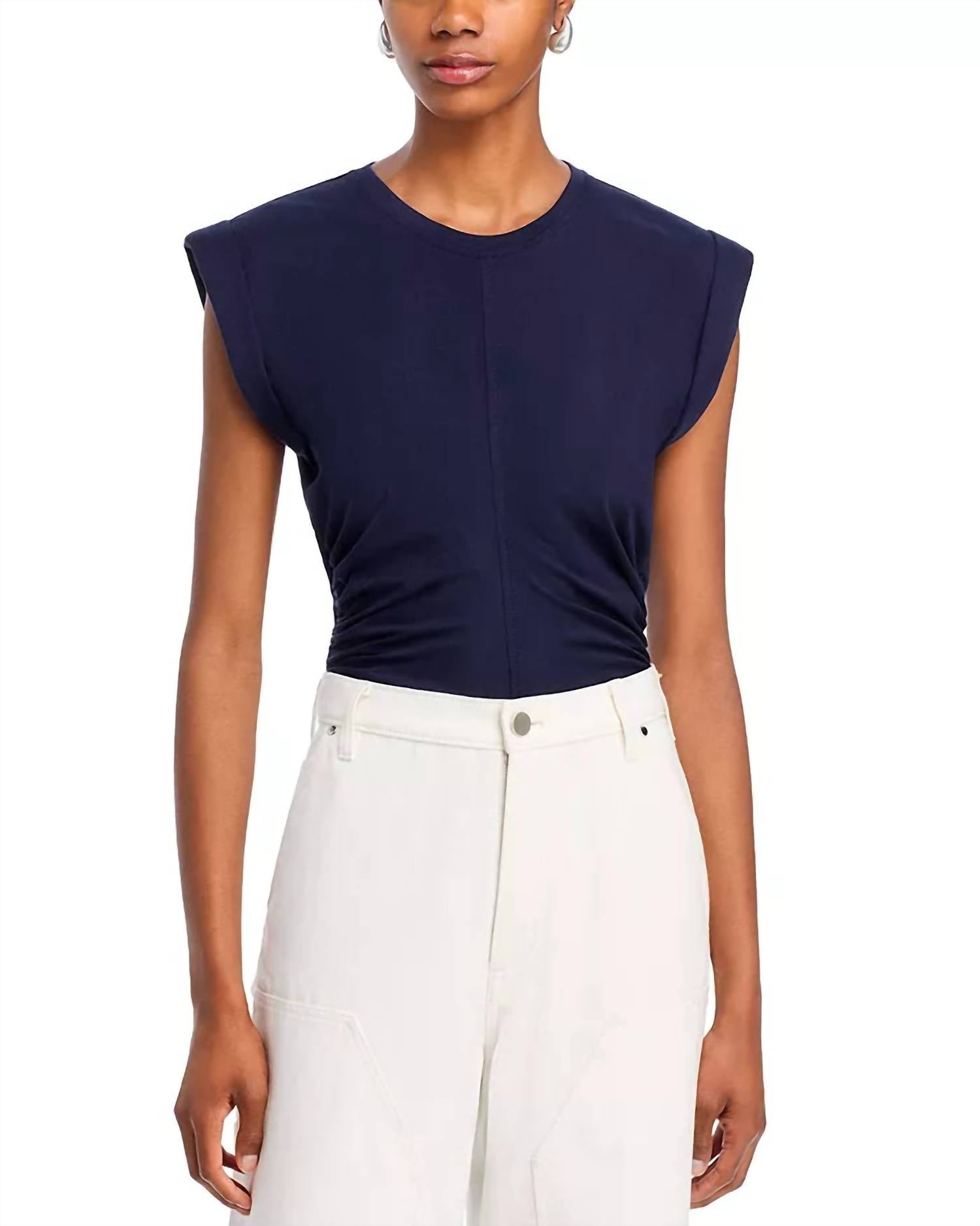 Pair this crop top with your favorite high-waisted jeans or maxi skirt. Discover the Women's Nia Top by A.L.C., a chic addition perfect for your minimalist summer wardrobe. Featuring cap sleeves and a crewneck, this crop top is crafted from a clean finish jersey that offers a sculptural silhouette in timeless white. The design includes rolled cap sleeves, subtle side ruching, and a vertical front seam, providing elegance and a lengthened line. Closure: Pull-on.