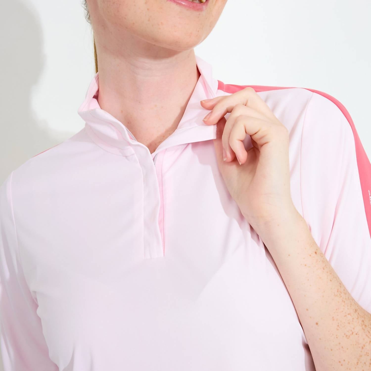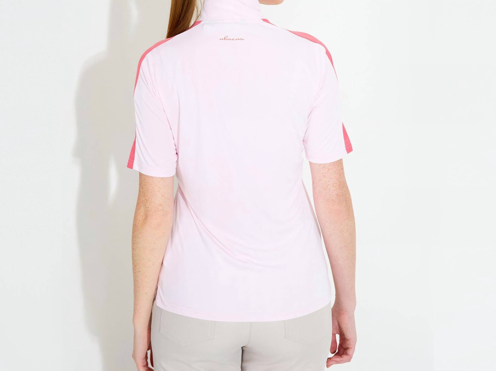 Introducing the Aloha Half-Zip Short Sleeve Shirt by Abacus Sportswear US, designed for women seeking both style and sun protection. This sporty top in light pink features short sleeves, a mockneck, and a zip closure, perfect for a day on the golf course. Made from nylon with a UPF 50 rating, it offers enduring UV protection without chemicals, while DryCool technology ensures you stay cool and comfortable. Care: Machine wash and line dry.
