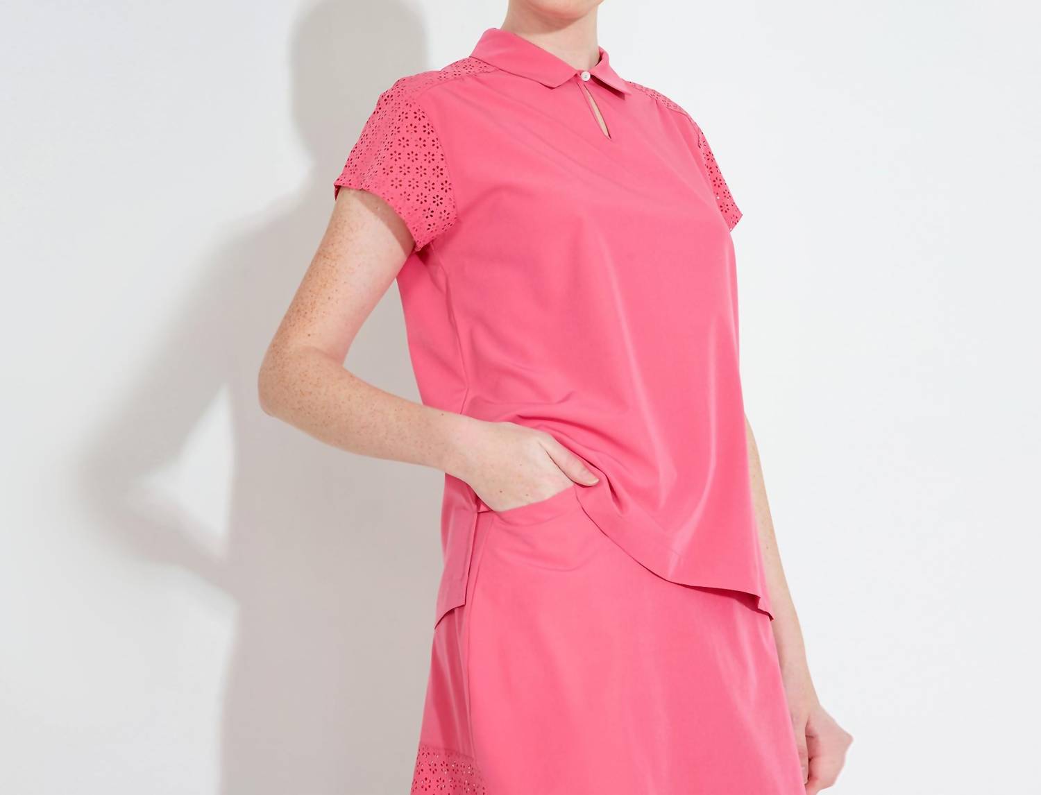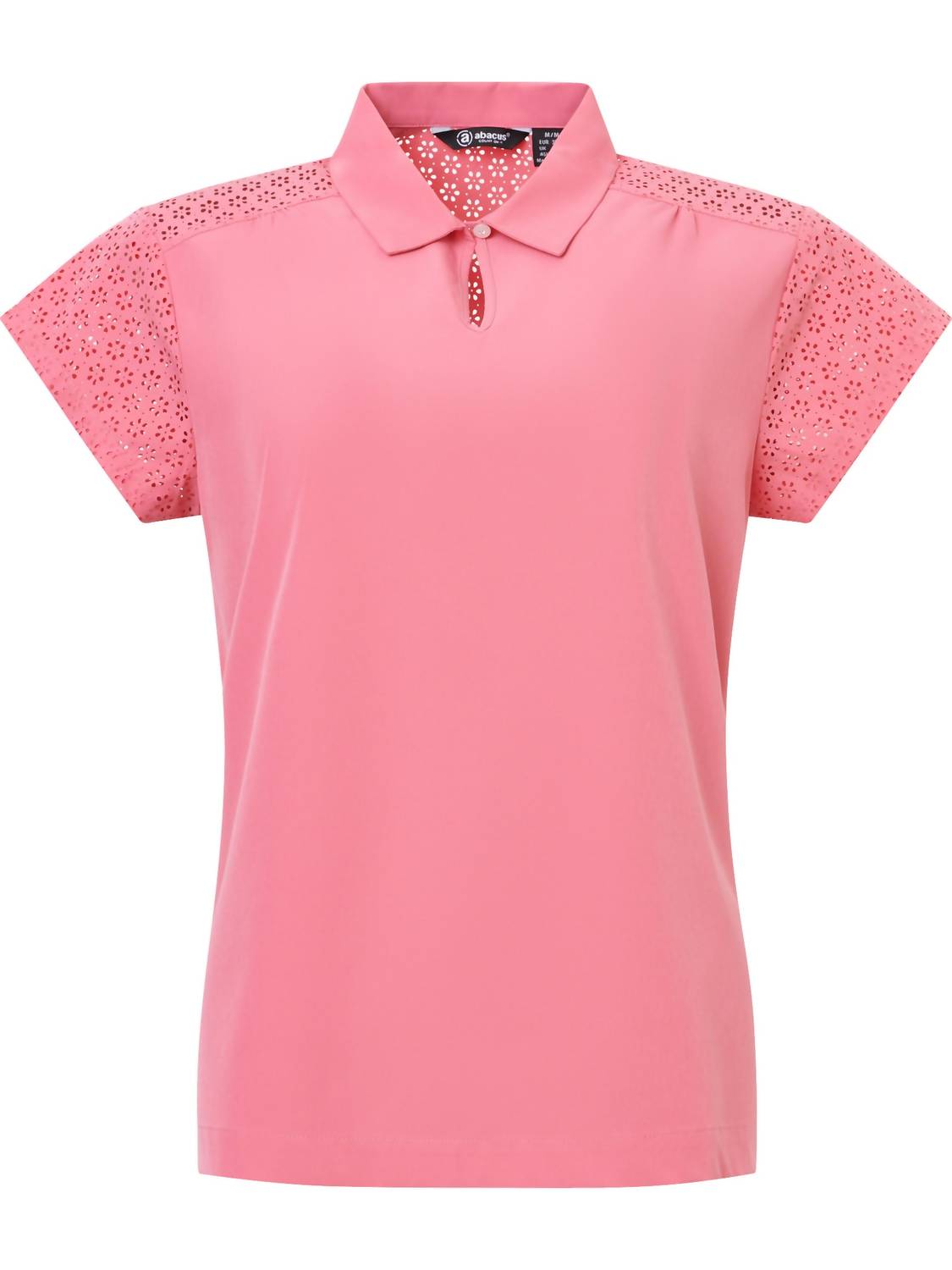 Introducing the Manga Cupsleeve Polo by Abacus Sportswear US, a stylish choice for active women. This lipstick-colored short sleeve top is crafted from breathable polyester with 4-way stretch, perfect for summer and game days. The intricate flowery pattern and decorative rhinestone button at the collar add a touch of elegance to this solid design. Closure: Pull on. Care: Machine wash and tumble dry.