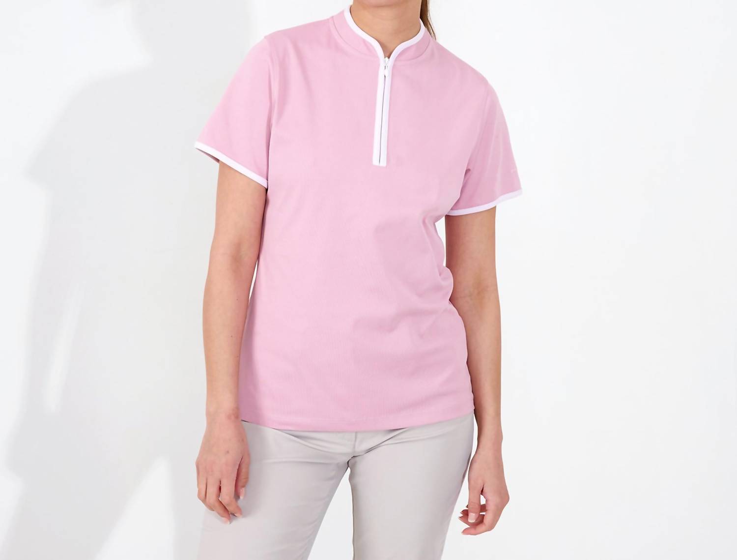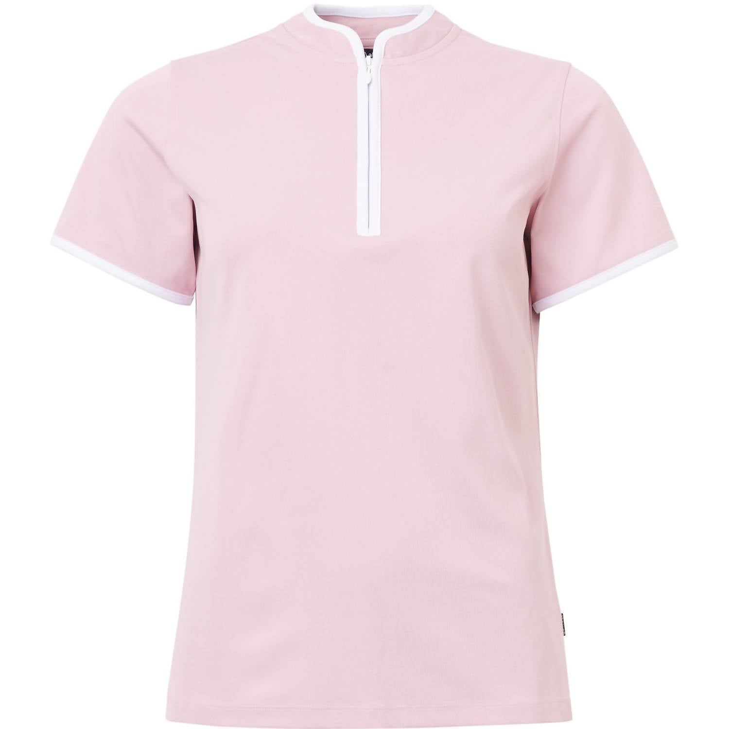 The short sleeve tee you'll want in every color. Discover the Turnberry Half Zip Polo by Abacus Sportswear US, a chic addition to your summer wardrobe. This women's short sleeve polo in dusty pink boasts a soft V-neck with a convenient half-zip closure. Made from recycled polyester, it offers a blend of breathability, comfort, and freedom of movement, ideal for game day or casual wear. Emphasizing its sporty appeal, the contrast colors at the sleeve hems and Abacus logo on the right sleeve complement its solid pattern. Care is straightforward with machine wash and line dry instructions.