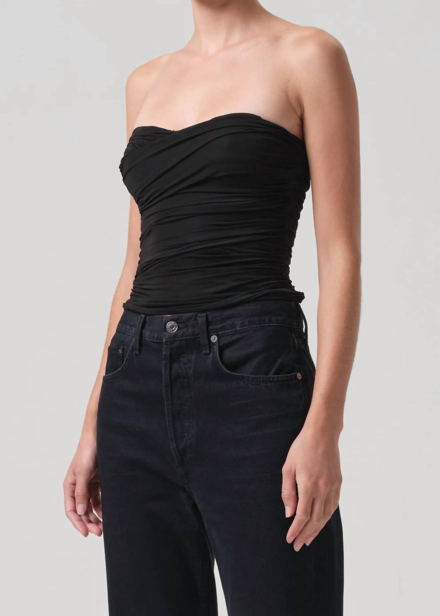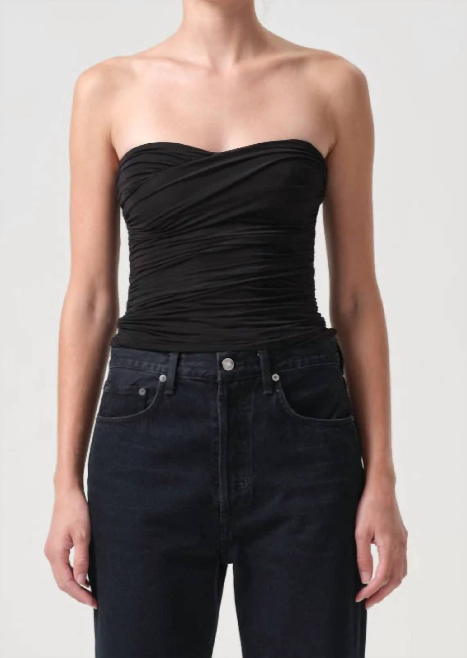 Esta regata clássica é perfeita para usar em camadas e é fofa o suficiente para ser usada sozinha. Abrace a elegância com o Top Tubinho Tonia da AGOLDE, uma peça preta marcante confeccionada nos Estados Unidos. Com uma mistura luxuosa de 90% Viscose, 5% Elastano e 5% Poliamida, este top sem alças oferece um design elástico com um toque ajustado ao corpo. Ele destaca o decote coração com detalhes em torção, realçando sua versatilidade. O fecho é prático e fácil de vestir, e o cuidado é fácil com as instruções de lavagem à máquina.