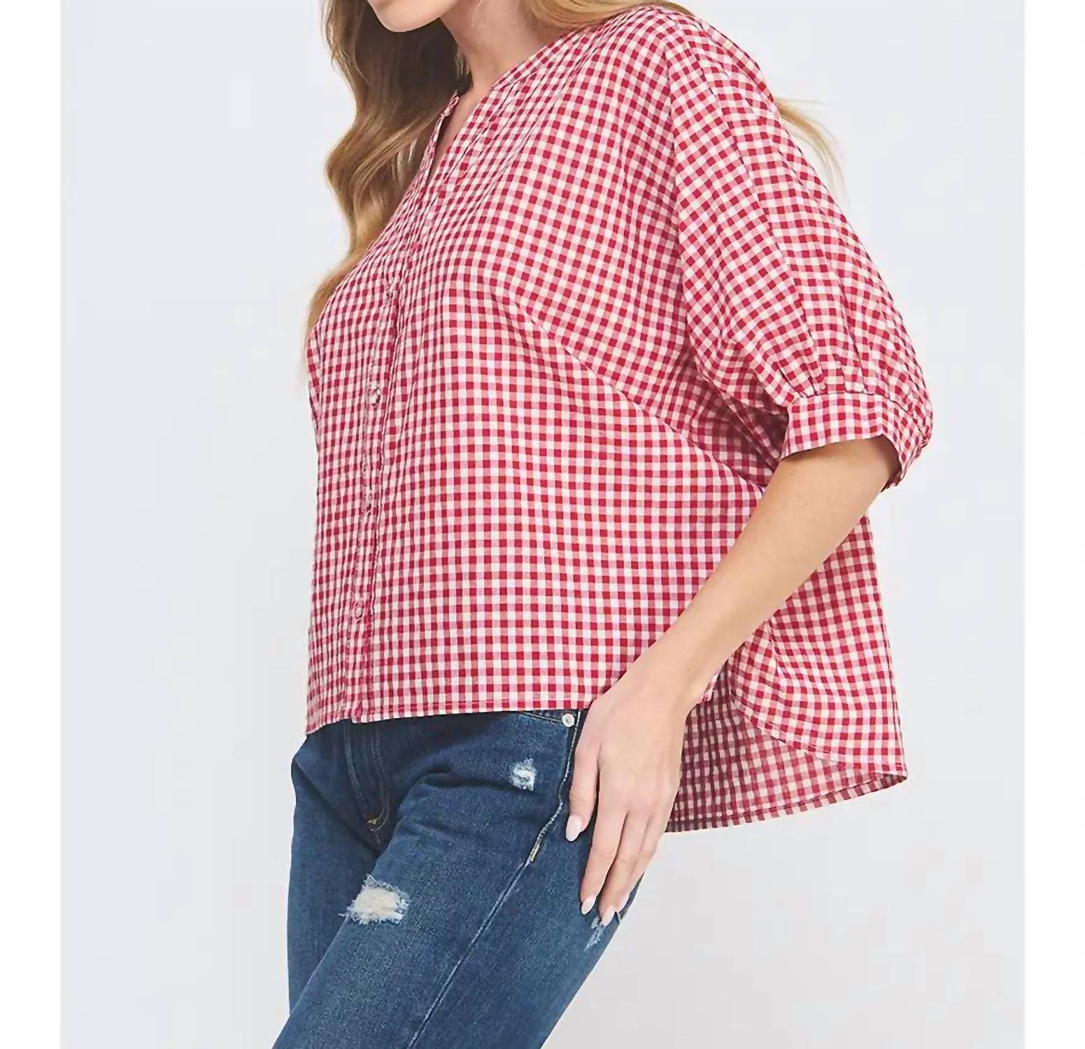 A timeless blouse that will never go out of style. Discover the Seersucker Dolman Top by ALLIE ROSE, a chic piece perfect for any occasion with its timeless red gingham pattern. Crafted from breathable cotton, this top features elbow-length sleeves and a flattering V-neckline for effortless elegance. Closure is secured with a stylish button closure. Care for this garment easily with machine wash and line dry instructions.