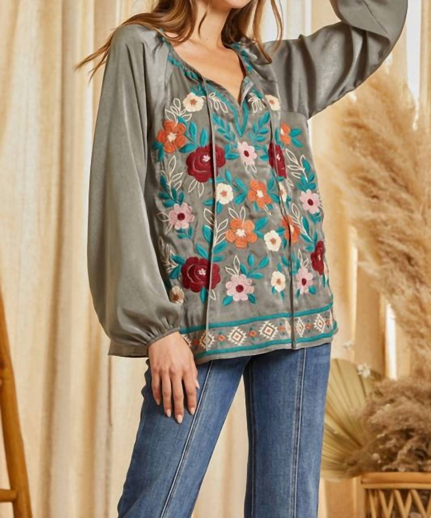Introducing the Velvety Embroidered Satin Blouse by ANDREE BY UNIT in a chic charcoal hue, perfect for fall gatherings. This women's blouse features long sleeves and a V-neck, crafted from 100% polyester that's wrinkle-resistant with luxurious velvety satin. The intricate floral embroidery adds a boho chic touch, completed with a front neckline self-tie for a charming silhouette. Made with care and precision, it is imported and should be hand washed to maintain its beauty. Approximate measurements include a bust of 38-42 inches and a length of 26-28 inches.