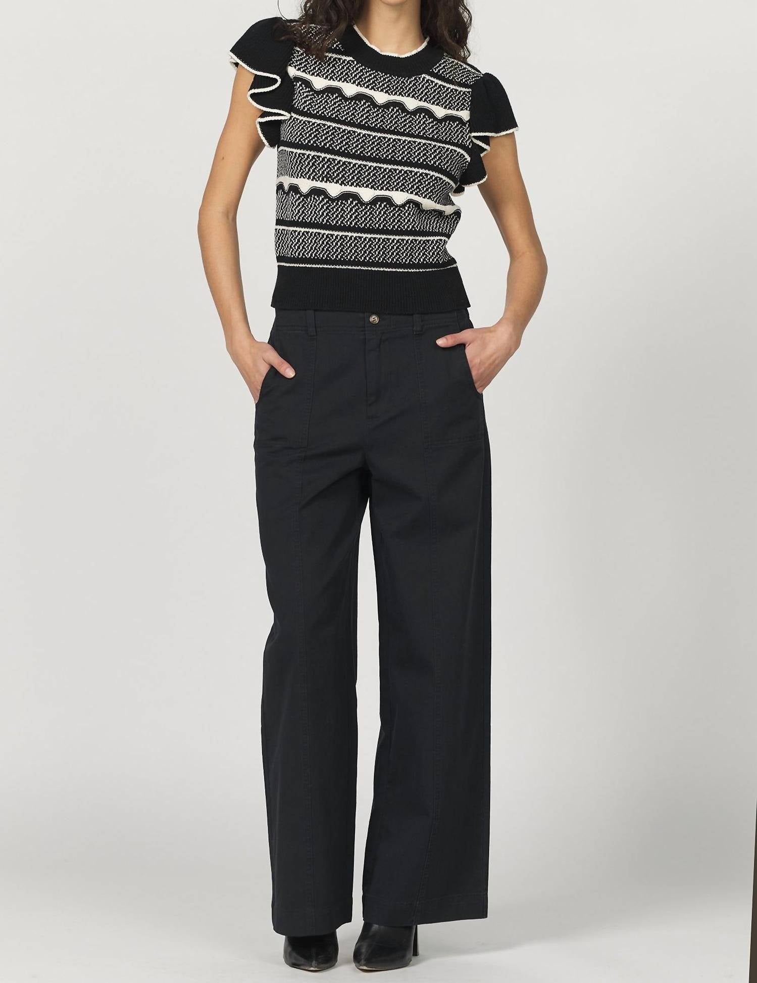 A versatile blouse that works from desk to dinner! Introducing the Bethany Ruffle Sleeve Stripe Shirt by Another Love, a chic addition to your wardrobe in Black Multi. This women’s blouse features cap sleeves with ruffle details and a textured stripe pattern, complete with a crewneck for a classic look. Crafted from 100% Cotton, this pull-on shirt offers both comfort and style. With a body length of 20", a sleeve length of 4.5", and a bust measurement of 34" for size X-Small, it’s perfect for fall occasions like Thanksgiving and homecoming.