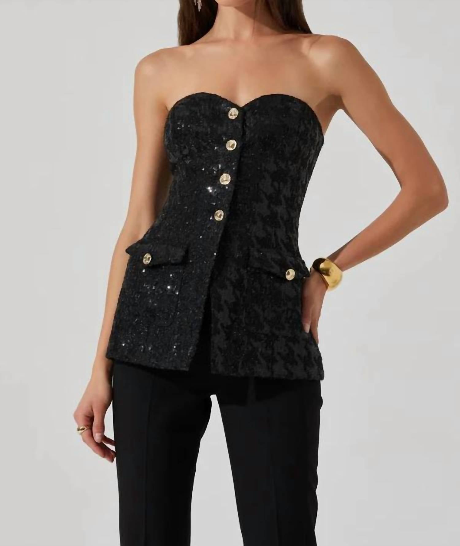 Introducing the ASTR Adeline Sequin Houndstooth Bustier Top in a textured black design, ideal for a chic dinner party look. This strapless top features a flattering sweetheart neckline and functional front pockets for added style and convenience. Crafted with 100% Polyester and featuring a fully lined interior, it measures 26 1/4" in length and 32" in bust for a size small. Closure: Button closure. Care instruction: Dry clean only. Perfect for embracing the "Quiet Luxury" trend this spring.