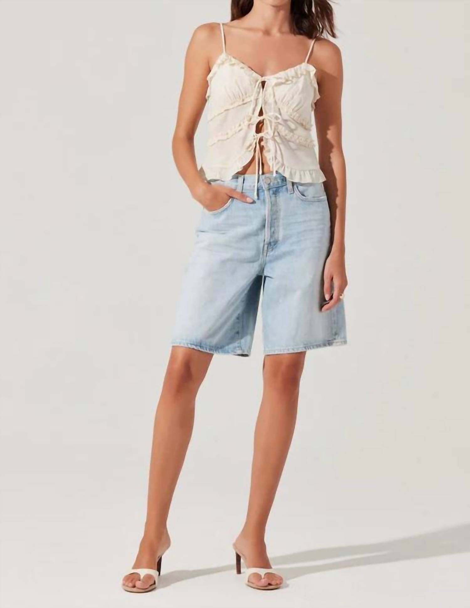 Introducing the Bea Tie-front Top by ASTR, a textured cream crop top perfect for summer vacations. Designed with adjustable spaghetti straps and a slight V-neckline, this top offers a flattering fit. It features a charming ruffled trim along the neckline and hemline, accentuated by hook closures and a tie-up detail for a keyhole effect. Closure: Tie closure.