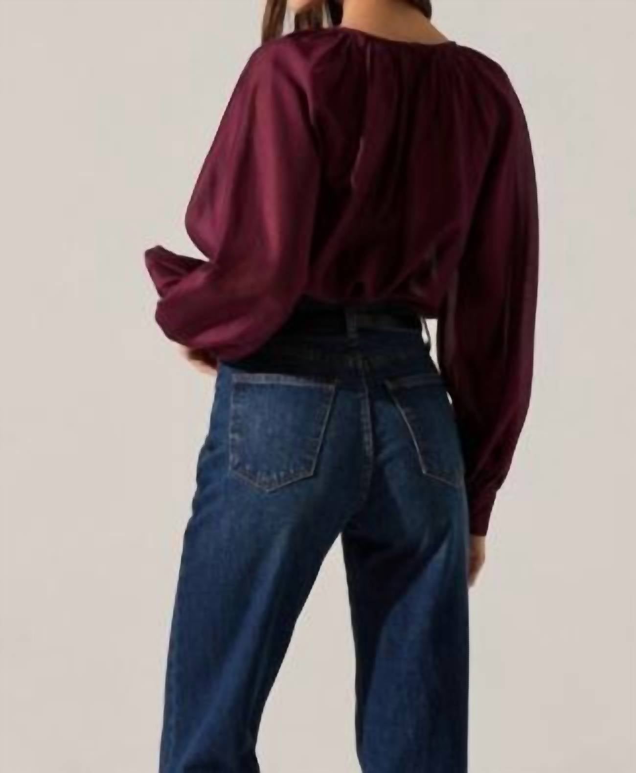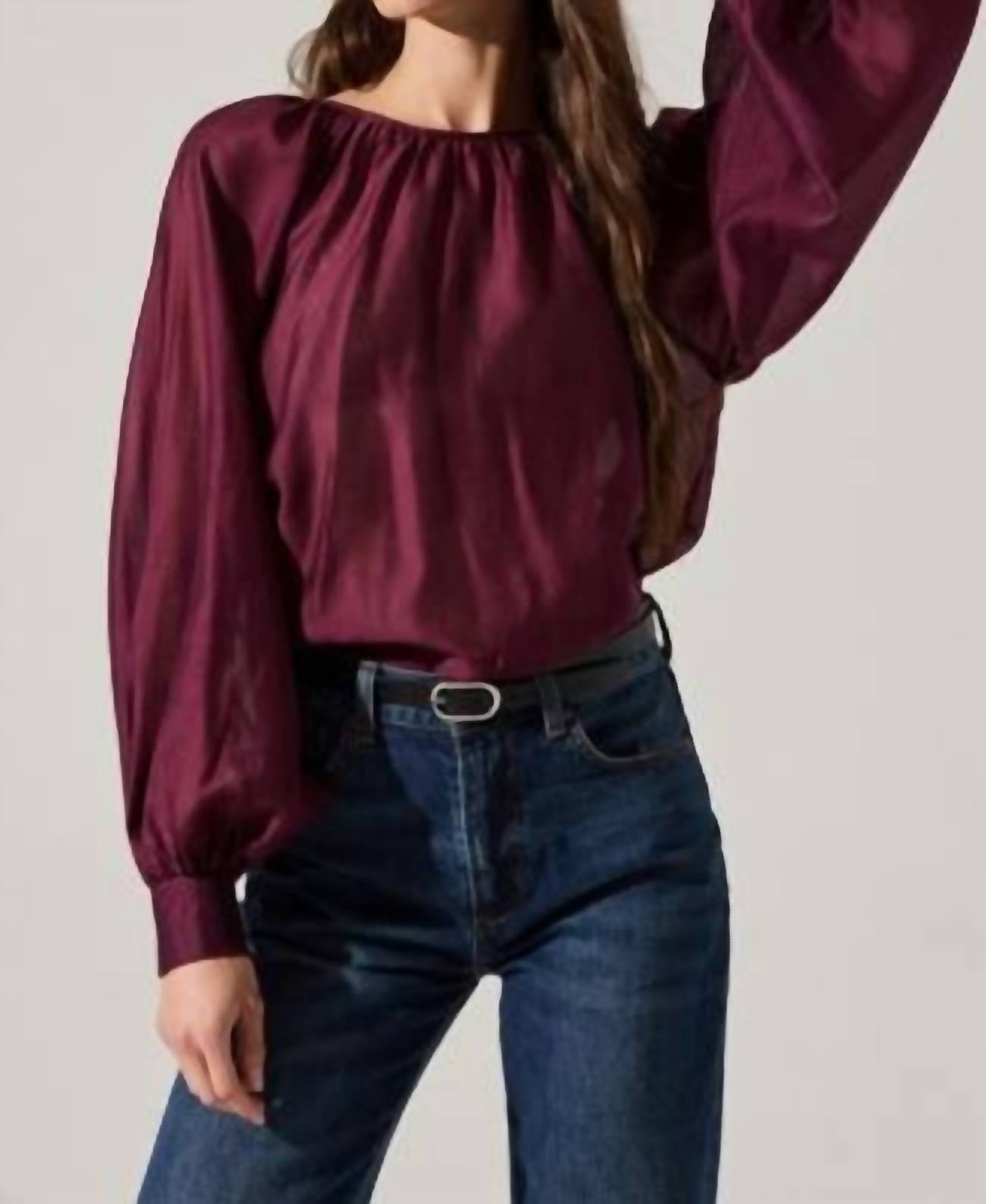 A timeless blouse that will never go out of style. The Reyen Top by ASTR in Deep Wine is an elegant choice for a holiday party, embodying the quiet luxury trend. This long sleeve blouse is crafted from 84% Lyocell and 16% Polyester, featuring a gathered round neckline and partially smocked sleeve cuffs with a triple button closure. The garment measures 24 inches in length with a 43-inch bust, highlighted by a keyhole cutout at the back neck with a button closure. Care for this sophisticated piece with dry cleaning, and experience a truly refined addition to your spring wardrobe.