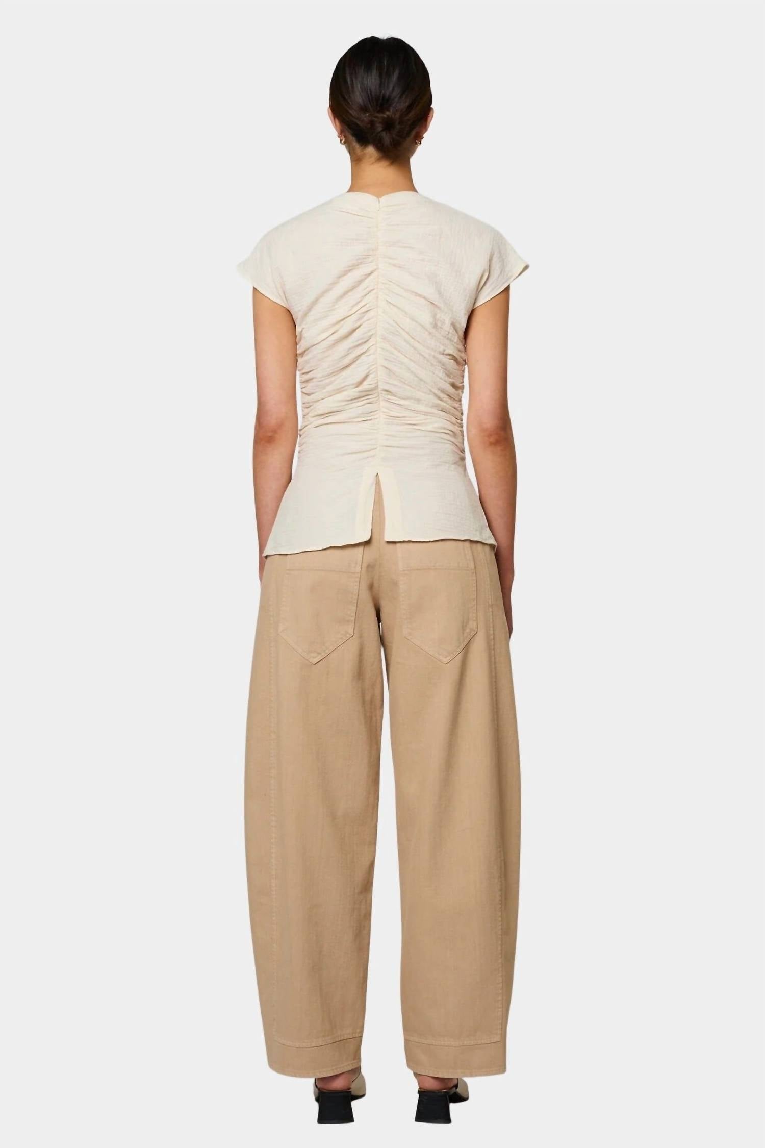 Show a little skin in this cute and casual crop top. Introducing the Renee Short-sleeved Top by Atelier Delphine, a stunning crop top in Kinari that beautifully merges a romantic silhouette with a modern edge. Crafted from 100% cotton, this piece is designed with delicate ruching at the front, back, and sides, complemented by a crewneck and solid pattern. Closure: Hidden back zipper. Care instructions: Machine wash on a gentle cycle or hand wash, and tumble dry low. This minimalist piece is ideal for a dinner party, making it a chic addition to your spring wardrobe. Model stands 5'10" and wears size XS. Made in the USA.