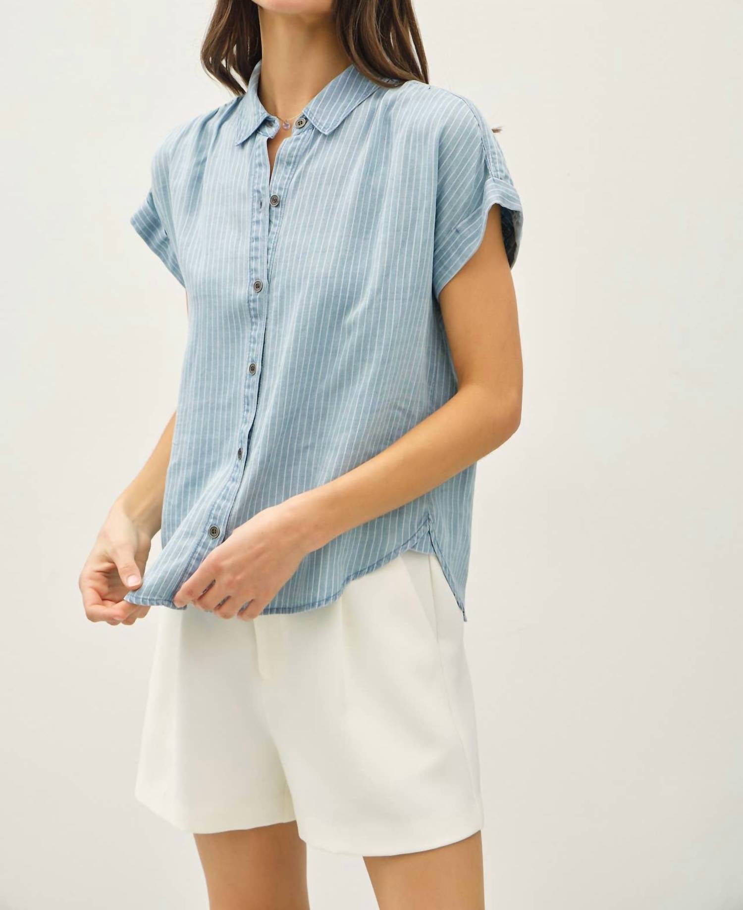 A classic button down shirt that will never go out of style. Enhance your wardrobe with the Tencel Button Up Top by Be Cool, a chic choice for versatile style in light blue denim stripes. This shirt features short sleeves with a rolled hem, crafted from 100% Tencel fabric for a comfortable fit. Designed with a collared neckline and button closure, it effortlessly complements any occasion. Perfect for spring, this top offers timeless charm without the fuss of pockets.